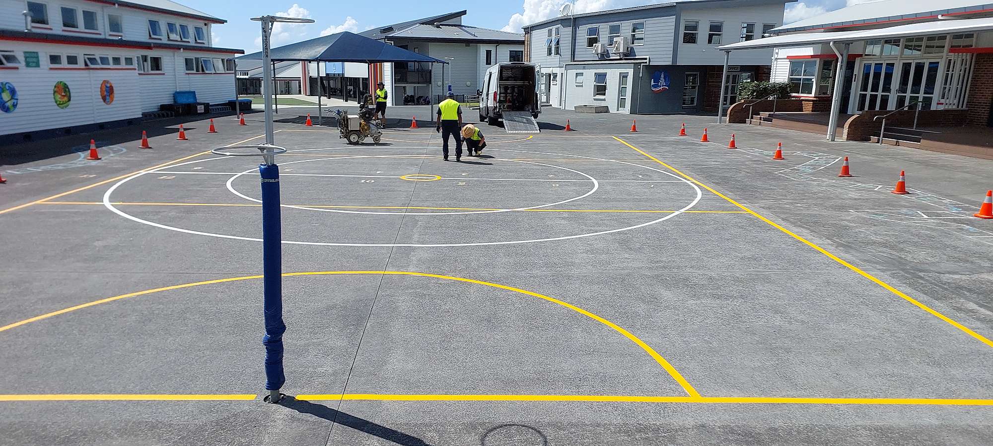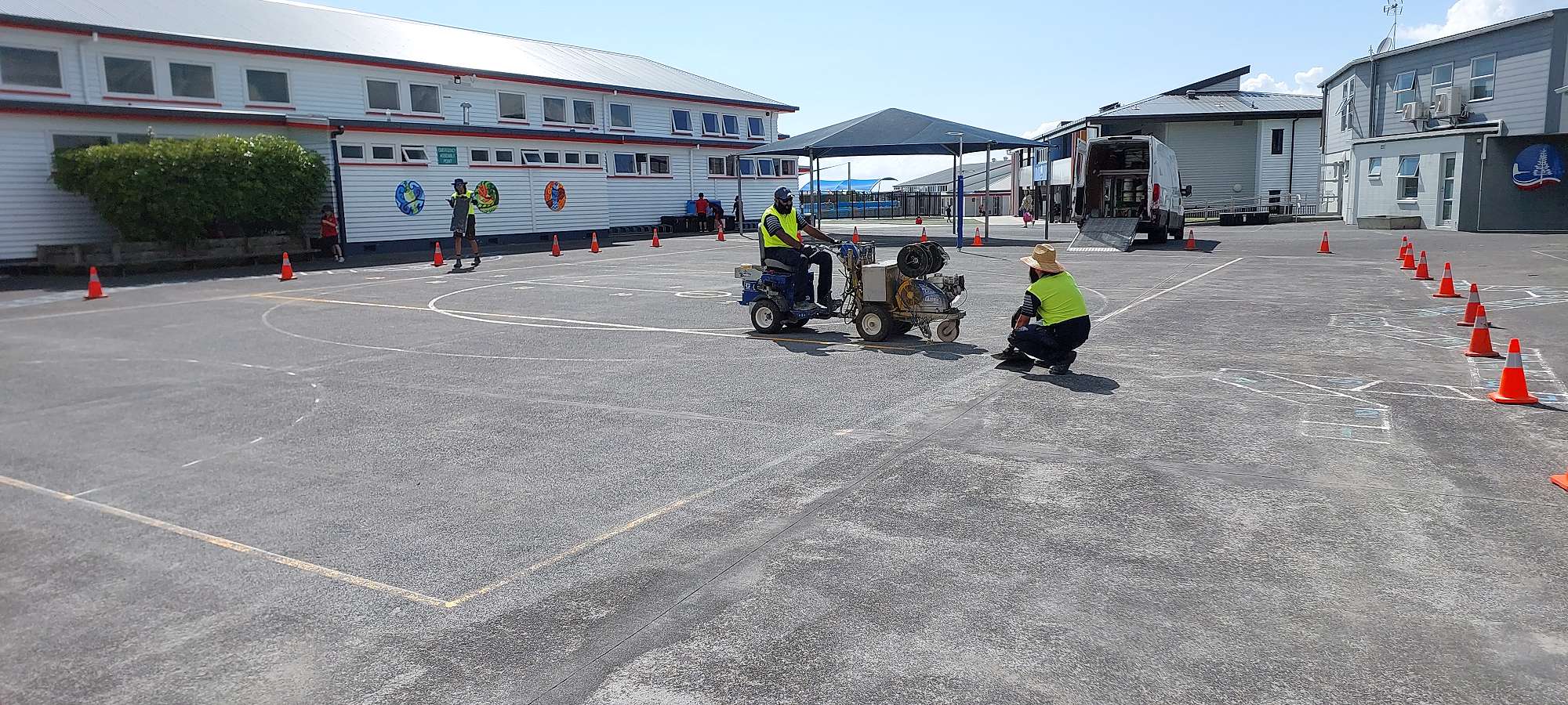 The Junior Netball and Games Court is pictured here being repainted. The area was water blasted and specialist machinery was used to complete the job. This is the start of the refurbishment of the concrete markings in the Junior area.