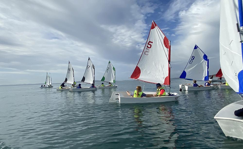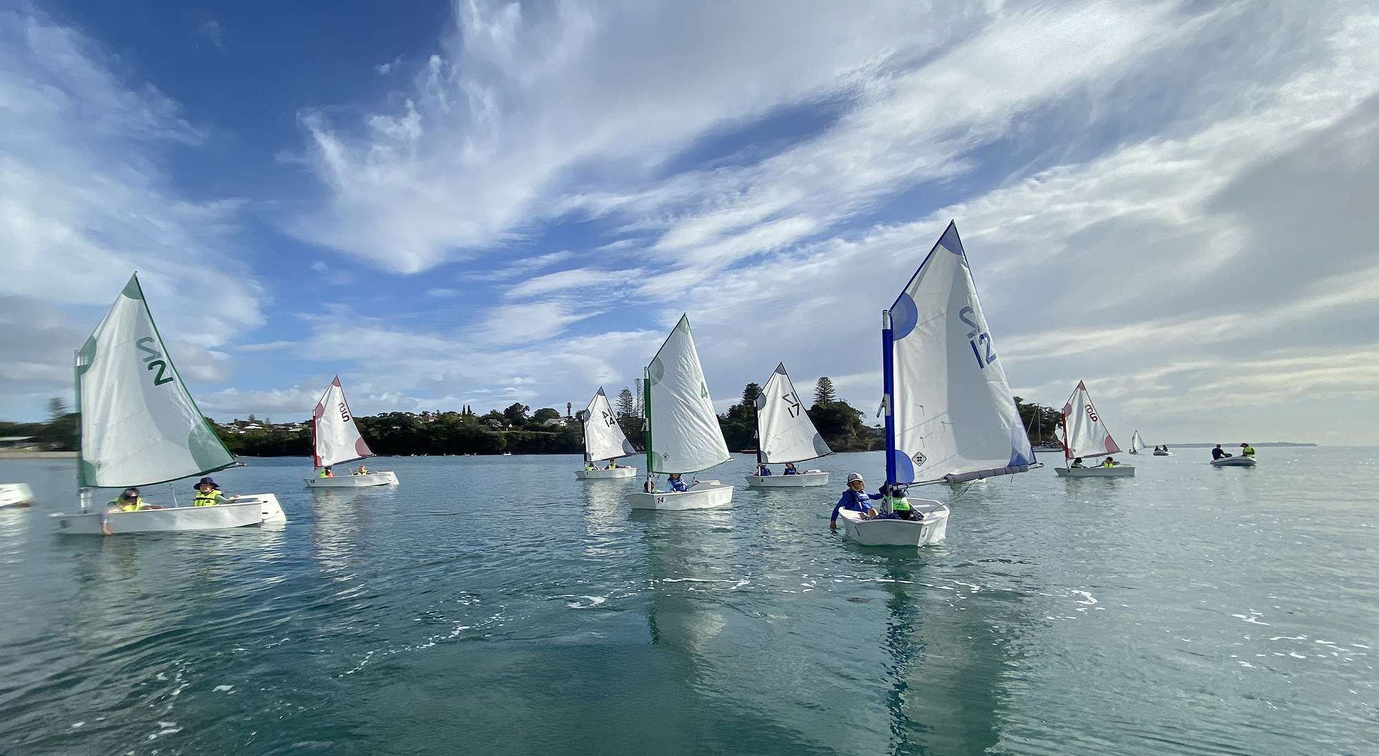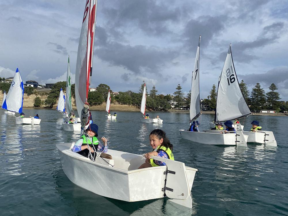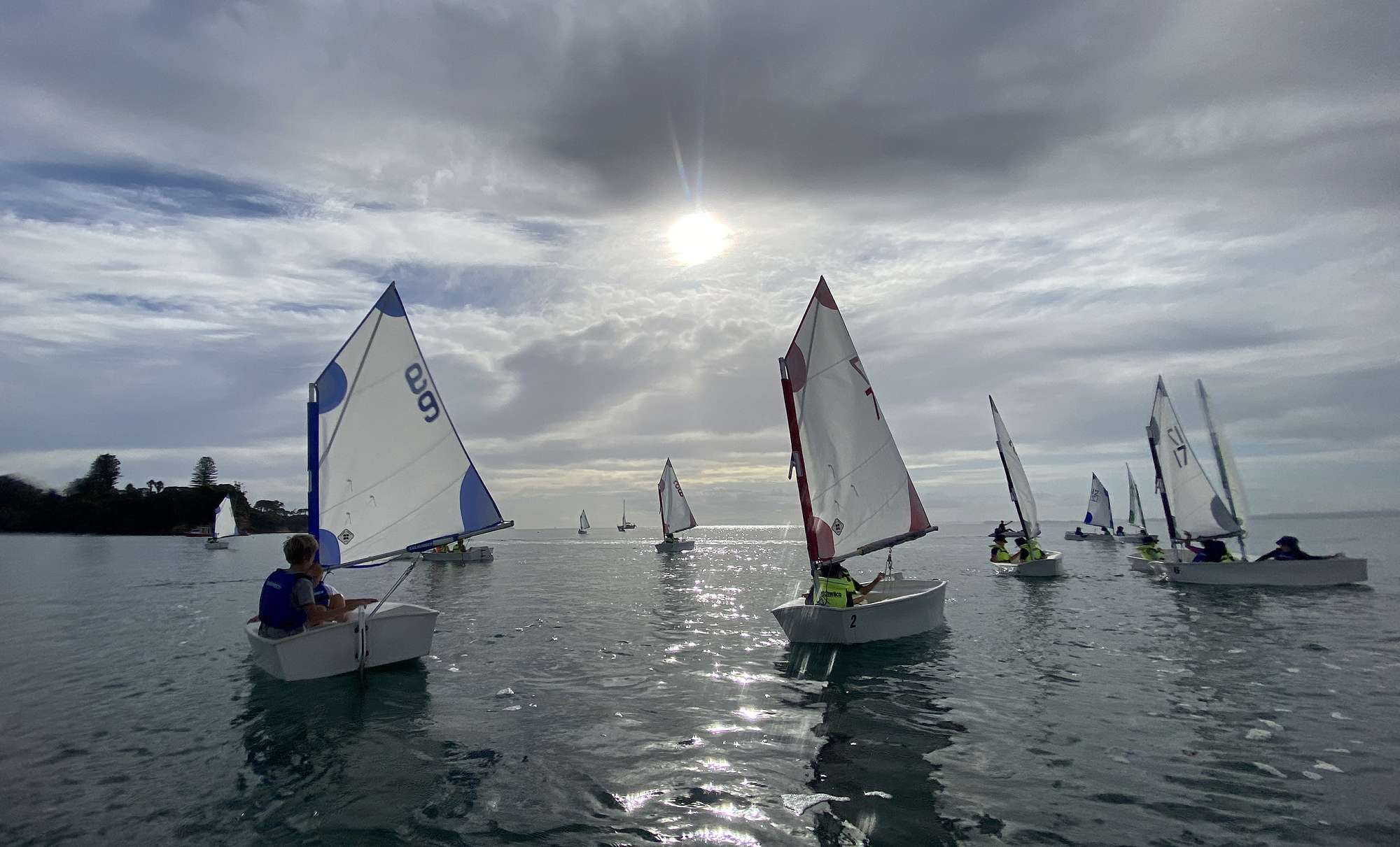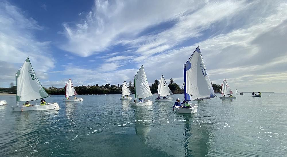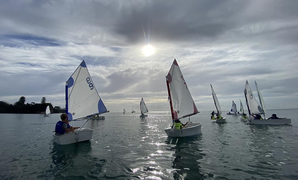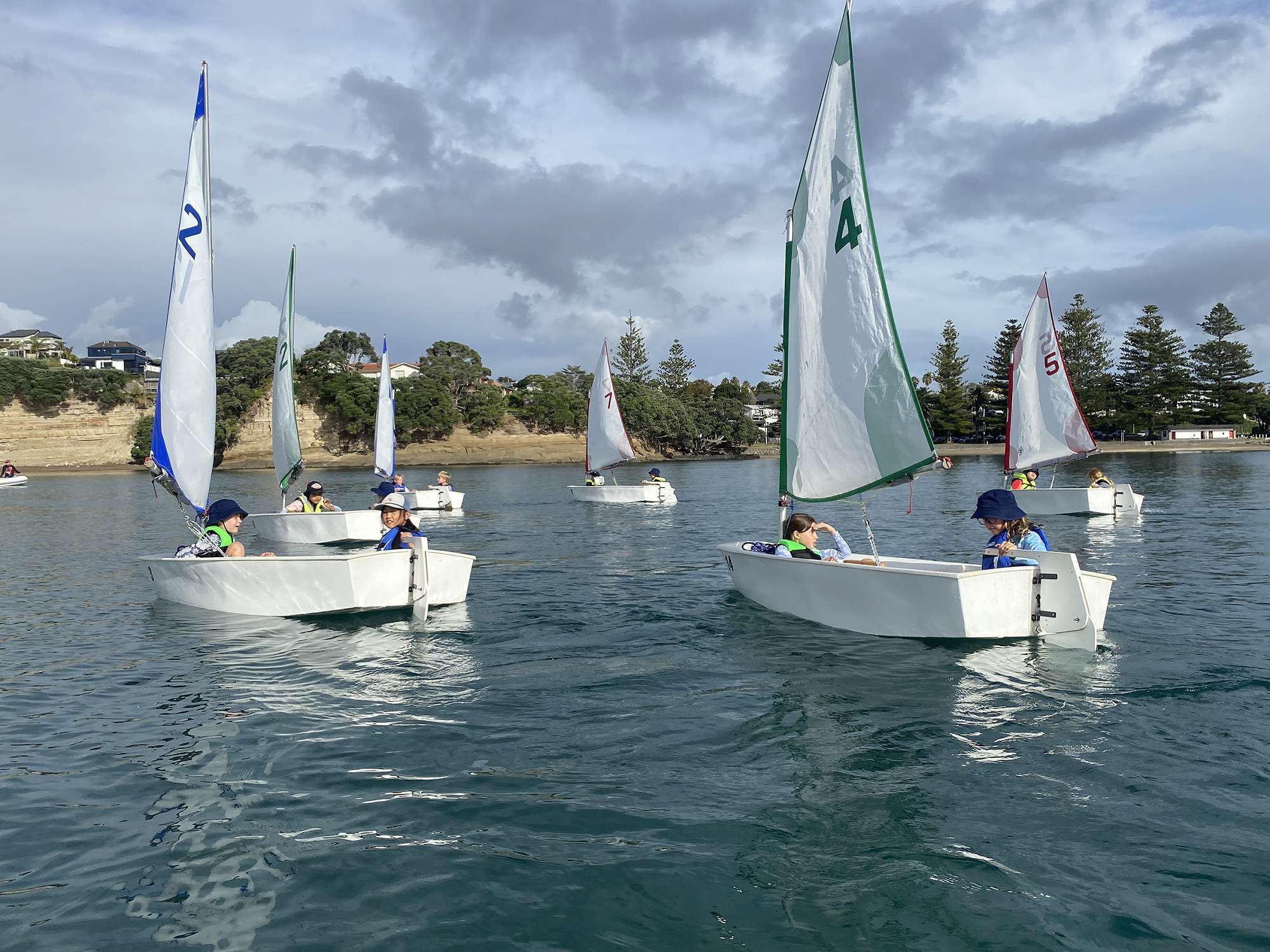 Some of our students out on the water, learning and enjoying the Level 5 sailing activities at Waiake Beach.