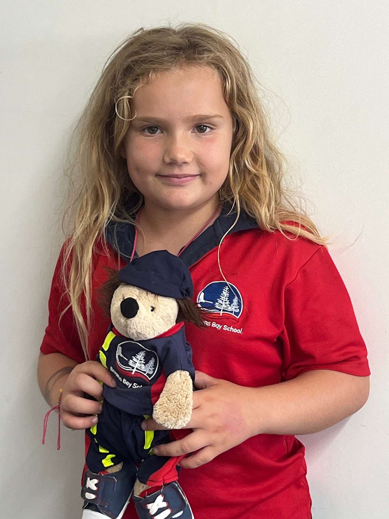 Kiara from Rm 16 has demonstrated our school values and enjoyed the day with our Mascot, Trimper.