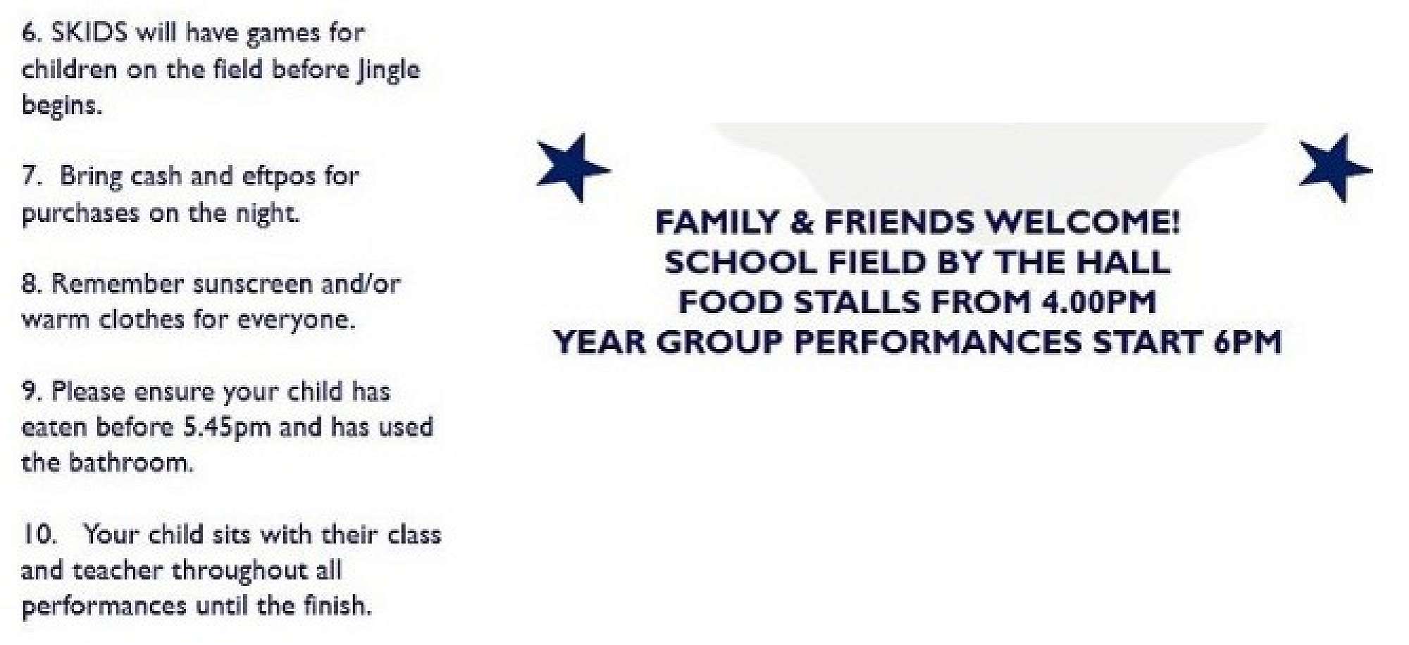 Jingle food stalls from 4pm. Year group performances start at 6pm. See our Top Tips below to enjoy a fun filled evening 🎄🎅