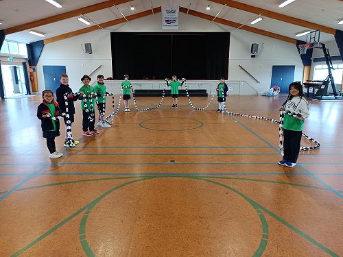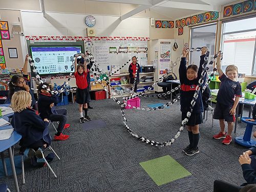 Each class created a black and white paper chain to visually represent the number of students in their class who travelled sustainably. These were joined together into one long chain and presented to the Senior classes. Students were given 10 seconds to estimate the total number represented. The Senior class with the closest estimate — along with a matched Junior buddy class — will receive a pizza lunch prize. The prize winners will be announced at our next Whole School Assembly. (See our Photo Gallery below for more photos).