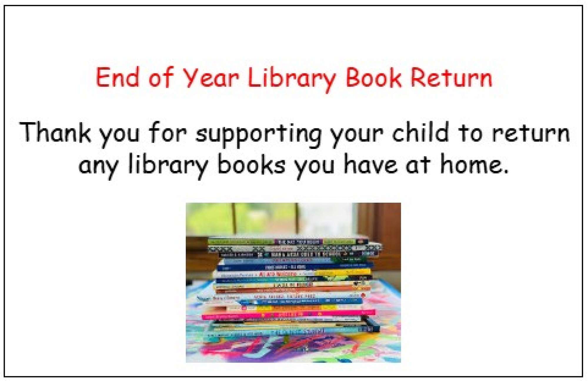 A reminder that all library and reading books are to be returned to school as we have a stocktake on Friday.