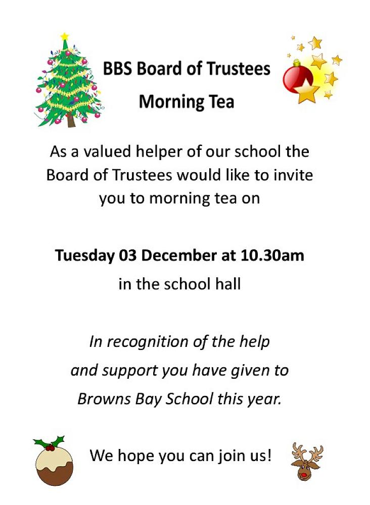Tuesday 03 December - BBS Board of Trustees Parent Helpers Morning Tea - 10.30am (School Hall)