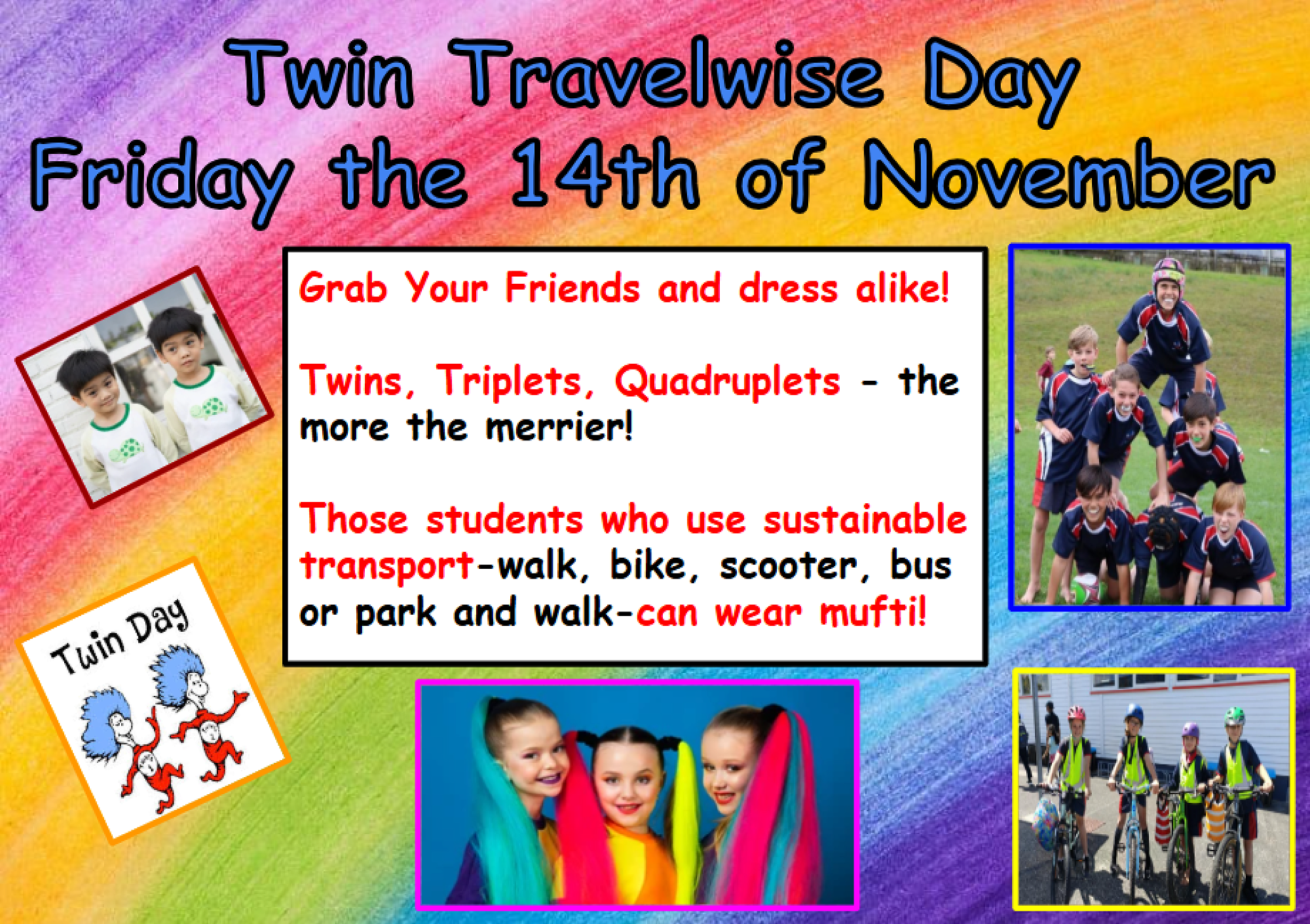 Next week, we will celebrate our Travelwise Event – Twin Day on Friday 14 November! Don’t forget to grab a friend (or a group) and plan your matching outfits and hairstyles. Remember, only students who come to school using sustainable transport—walking, biking, scootering, bus, or park and walk—can wear mufti. No gold coin is required. We can’t wait to see all the “twins” (and triplets, and more) around the school as we celebrate being Travelwise!
