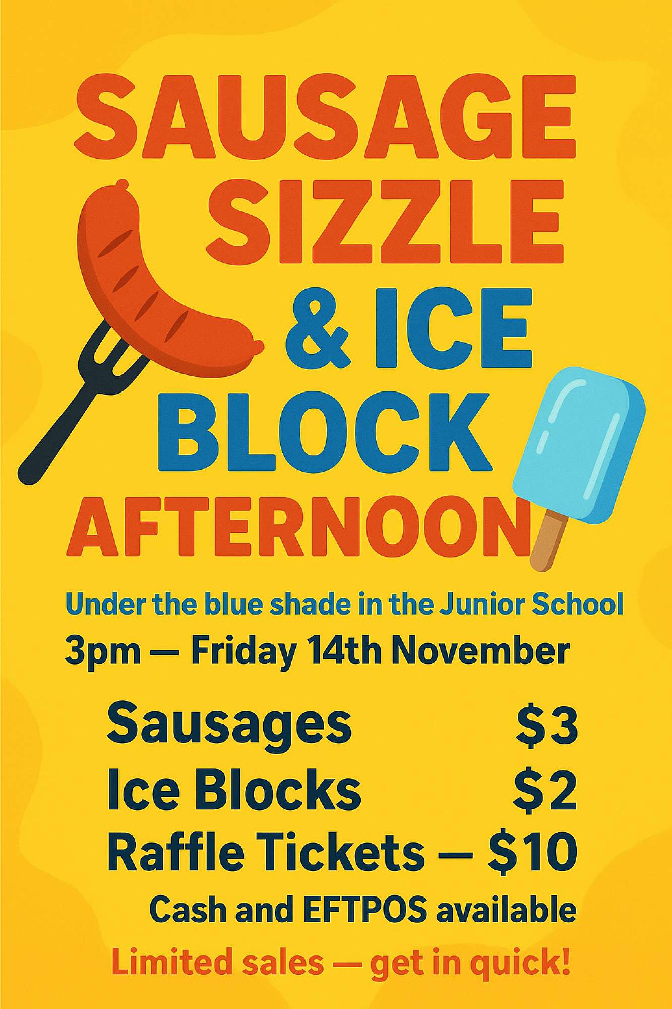 Sausage Sizzle & Ice Block After School Sale. Plus Raffle Tickets on Sale for the upcoming Grocery Grab Fundraiser (More information coming out tomorrow)