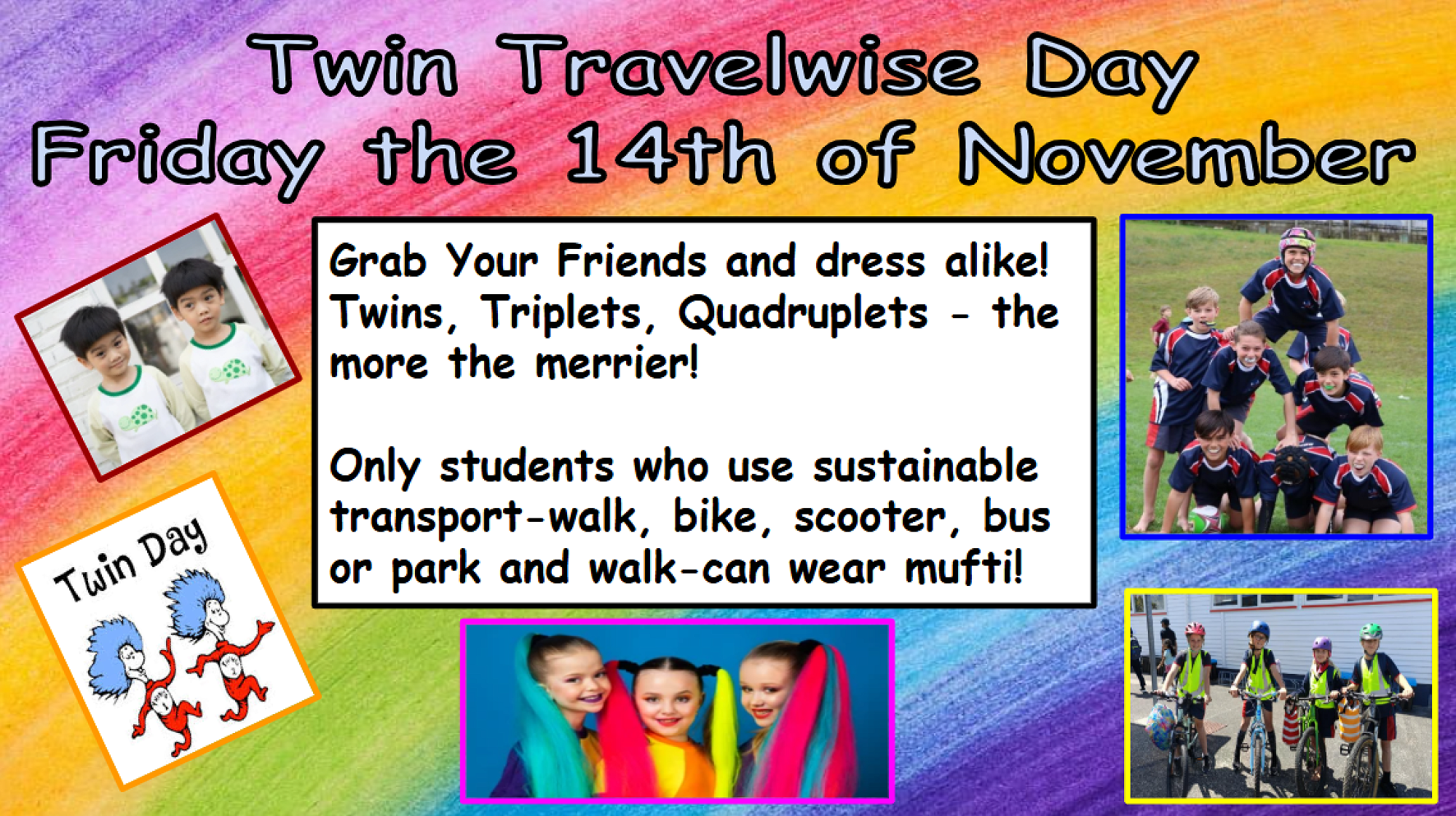 Get ready for some fun – the Travelwise Team is thrilled to announce our next Travelwise Event on Friday 14 November - Twin Day! Grab a buddy (or even a group of 3, 4, or more), and come to school dressed the same – matching clothes, hairstyles, and all! The best part? If you come to school using sustainable transport - walking, biking, scootering, bus, or park and walk—you don’t need to wear your school uniform. No gold coin needed. Let’s see how many “twins” (and triplets, and quadruplets!) we can spot around the school as we celebrate being Travelwise together!