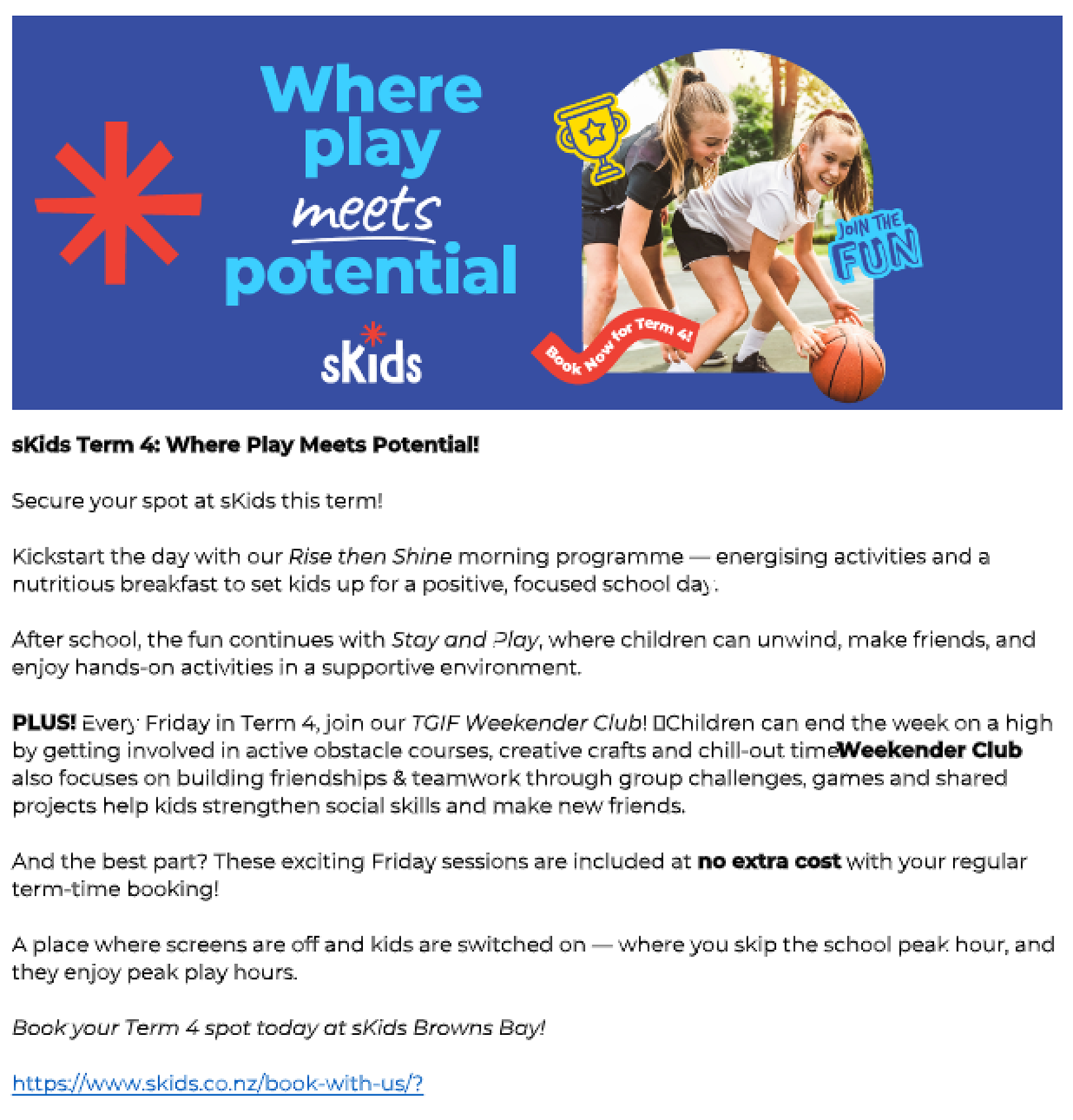 Unfortunately, due to very low bookings, sKids Browns Bay will not be open tomorrow (Thursday 23rd Oct) Thank you to those who expressed interest — we appreciate your understanding.