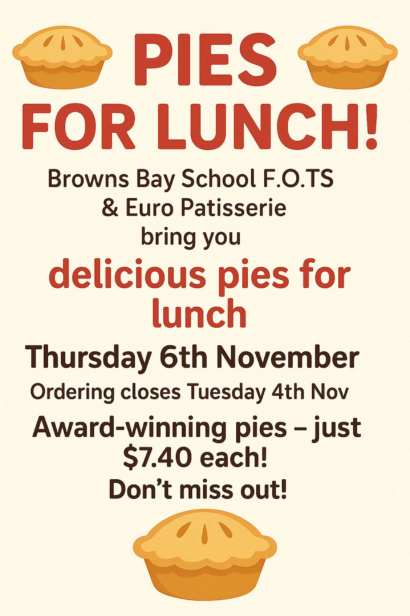 FOTS Pie Day - Thursday 06 November * orders on Kindo close Tuesday 04 Nov - (no late orders)