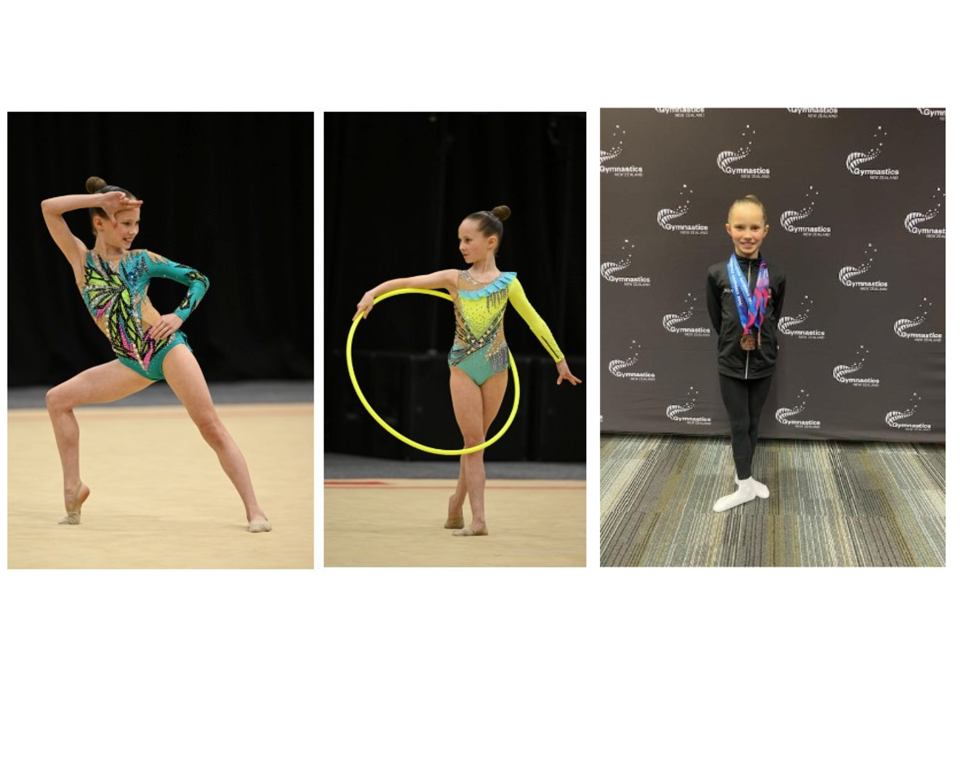 Margaret Woolf Memorial & NZ Secondary Schools, NHG – August 2025. This dual event was a highlight of Kira’s season. She delivered standout performances, earning 1st Place in Hoop, 2nd Place in Clubs, 3rd Place in Freehand, and was awarded 1st Place Overall.