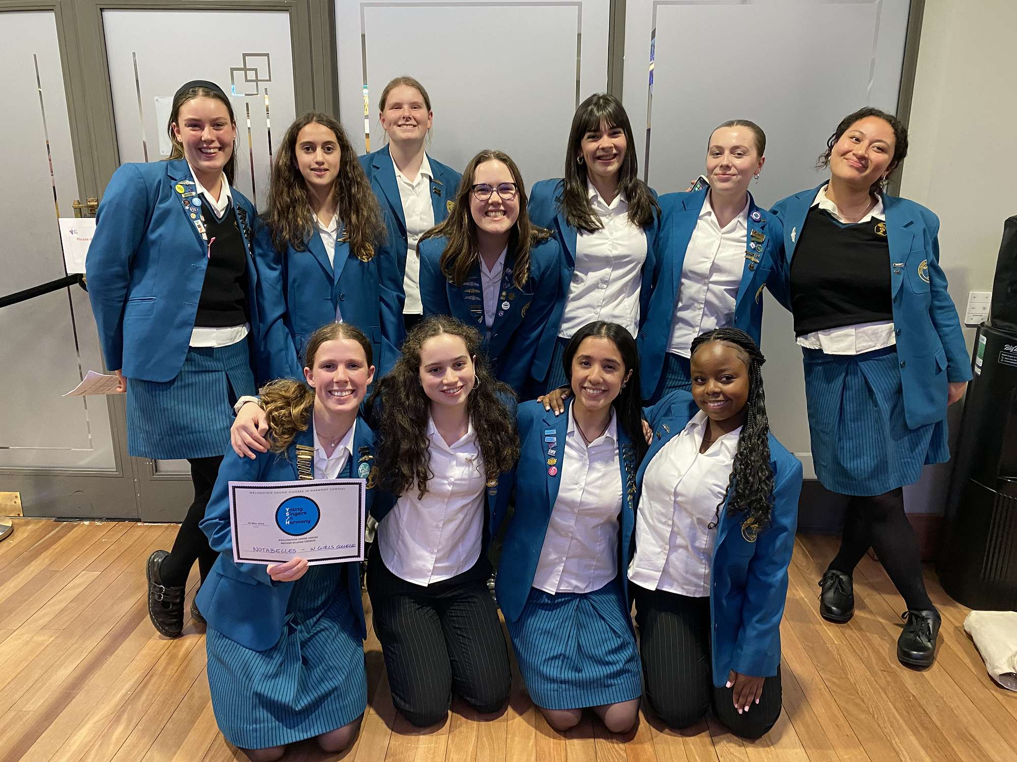 On the 20th of May WGC’s barbershop group, The Notabelles, competed in the Young Singers in Harmony Wellington regional competition at the Lower Hutt Town Hall. The Notabelles are a new group who came together at the start of the year when several students decided to bring barbershop back to WGC. They are organised and led by Holly, Tali Whiteridge, and Clara Kennedy.