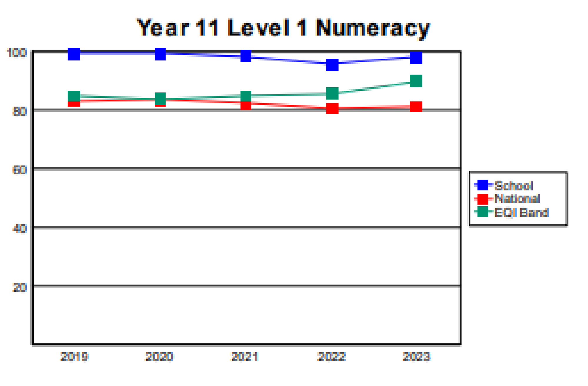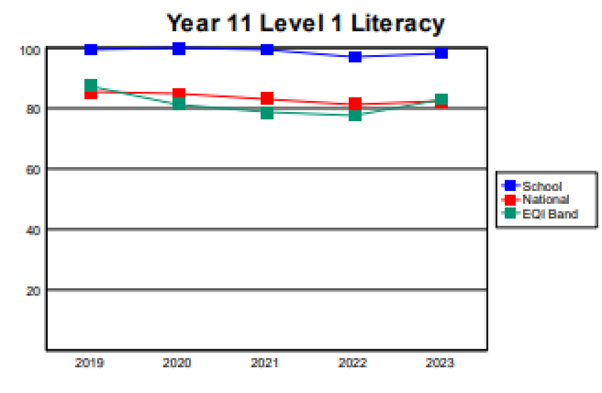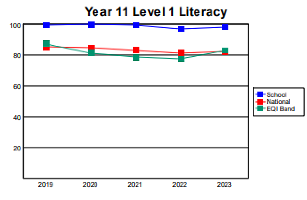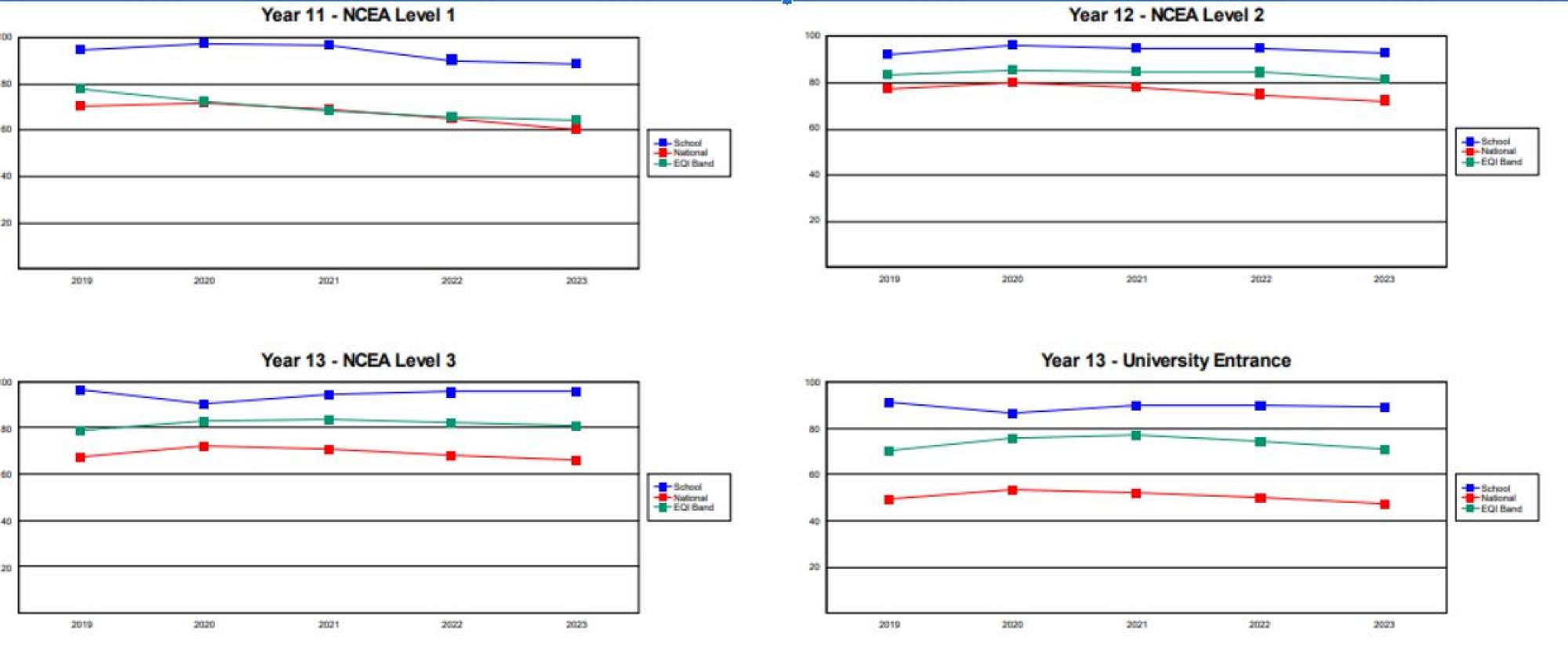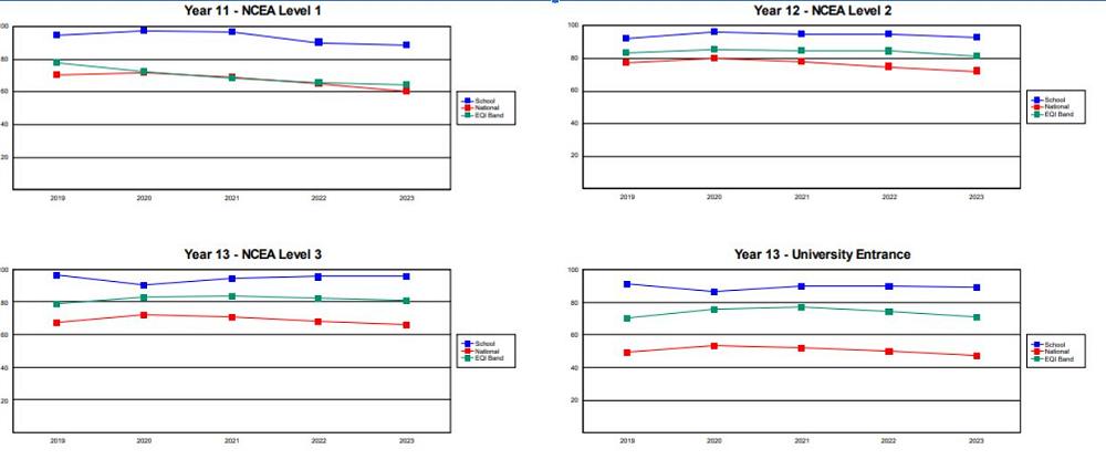 Our 2023 NCEA results were really good - the whole country has experienced a drop in results in recent years, but our relative position has stayed the same. To help you read the graphs below, we’re blue; schools a bit like us (socio-economic index based) are green and national results are in red.