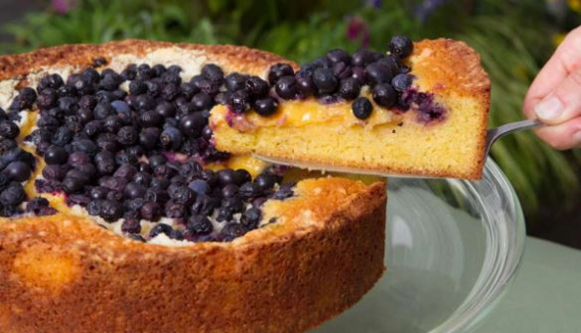 Evenly sprinkle the ground almonds over the passionfruit honey and top the entire cake with blueberries.