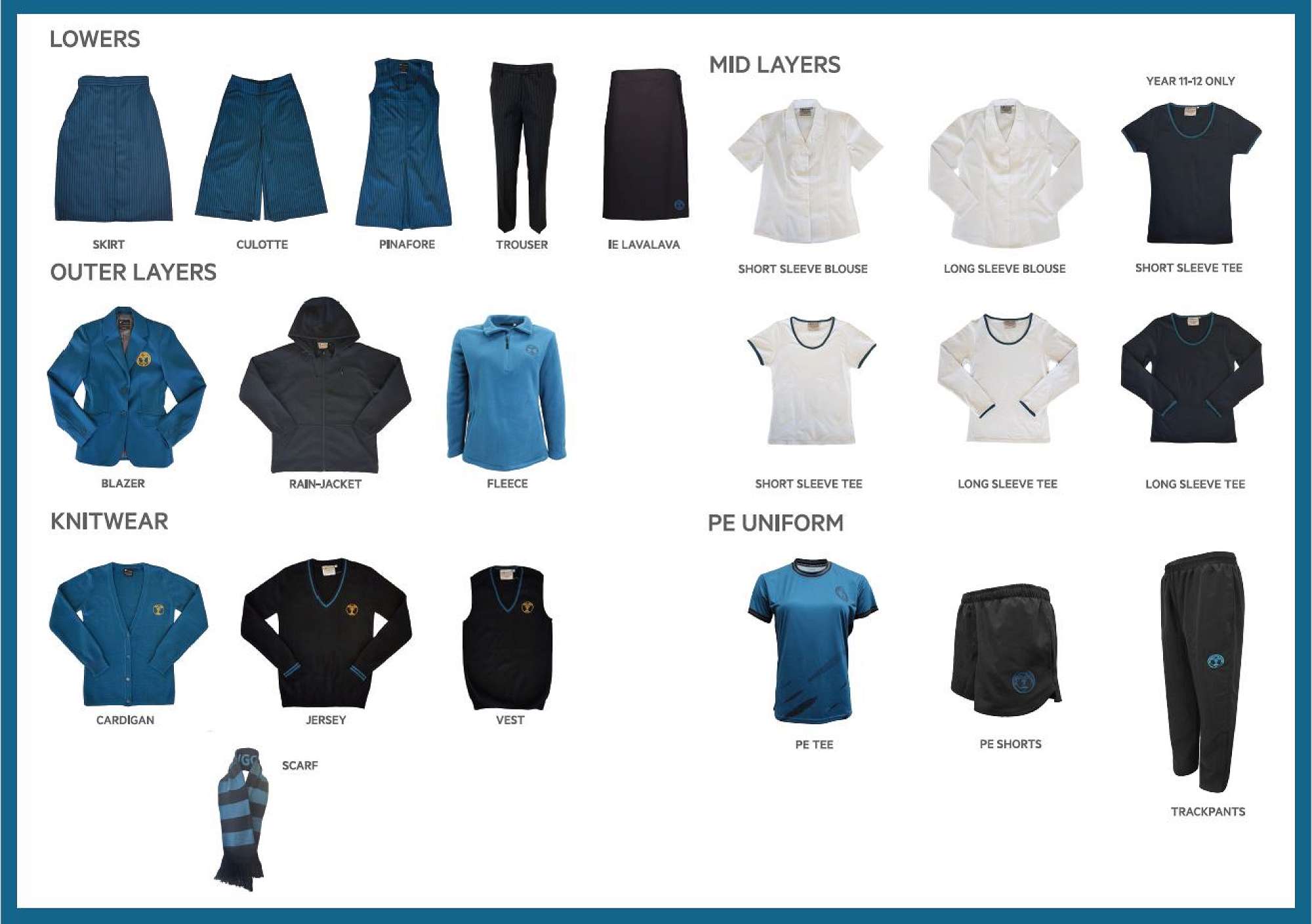 The uniform is a capsule style wardrobe with no summer/winter options. Instead students wear the garments that best keep them comfortable throughout the year. The choices are a skirt, a pinafore, culottes or trousers; long and short sleeves blouses and tshirts; a cardigan, a vest, a jersey, a blazer and a rain jacket. No item is compulsory apart from the PE uniform..
