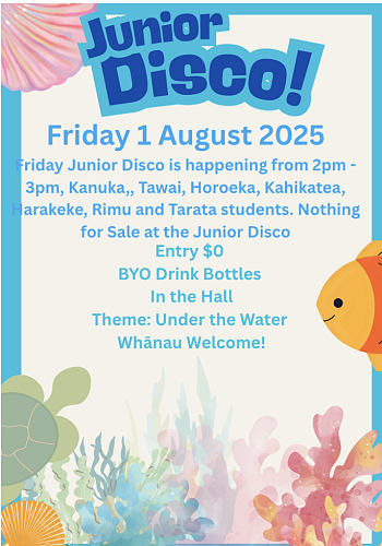 The Junior Disco is happening from 2 pm to 3 pm for Kanuka, Tawai, Horoeka, Kahikatea, Harakeke, Rimu, and Tarata students. Whānau are welcome to the Junior Disco, please come and boogie along with your kiddos. Remember your drink bottles. Please note that there's nothing for sale at the junior disco; it's simply a fun experience for the juniors.