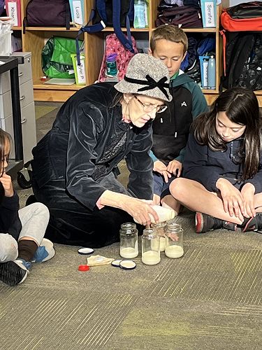 Once we were back in the classrooms, the boys and girls had to sit on separate sides of the room with children sitting in rows at tables, and younger children in the front. There were many activities that we enjoyed like making butter, using chalk to practice our cursive writing and fabulous needlepoint. Students also enjoyed some of the older school yard games such as knucklebones, pick up sticks and marbles.