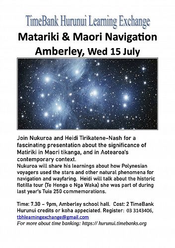 Matariki & Maori Navigation Join Nukuroa and Heidi Tirikatene-Nash for a korero around the significance of Matariki, the stars and other natural systems, that helped in navigating and wayfinding. Heidi will share about her journey as crew on the traditionally designed Waka Haunui, as part of the 2019 Tuia 250 Flotilla commemorations. Time: 7 – 8.30pm, Amberley School Hall, Wed 15 July. Cost: 1.5 TimeBank Hurunui credits or koha appreciated. Registrations: 03 3143406, tbhlearningexchange@gmail.com