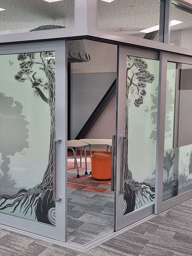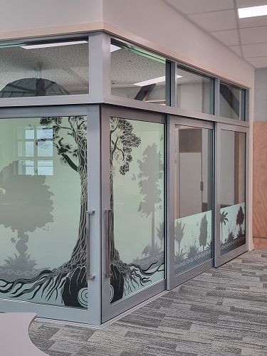 Our Board Presiding Member, John Bunting, spoke at our building blessing earlier this week and referenced one of the window manifestations (pieces of art work on the internal windows) in the new building, which can be seen in the photo above. It was designed by a group of our ākonga and one of our teachers at the time, Vanessa Shilston, several years ago. The artwork shows a rimu tree at the centre of the window, with a pair of hands holding a tiny seed underneath the tree.
