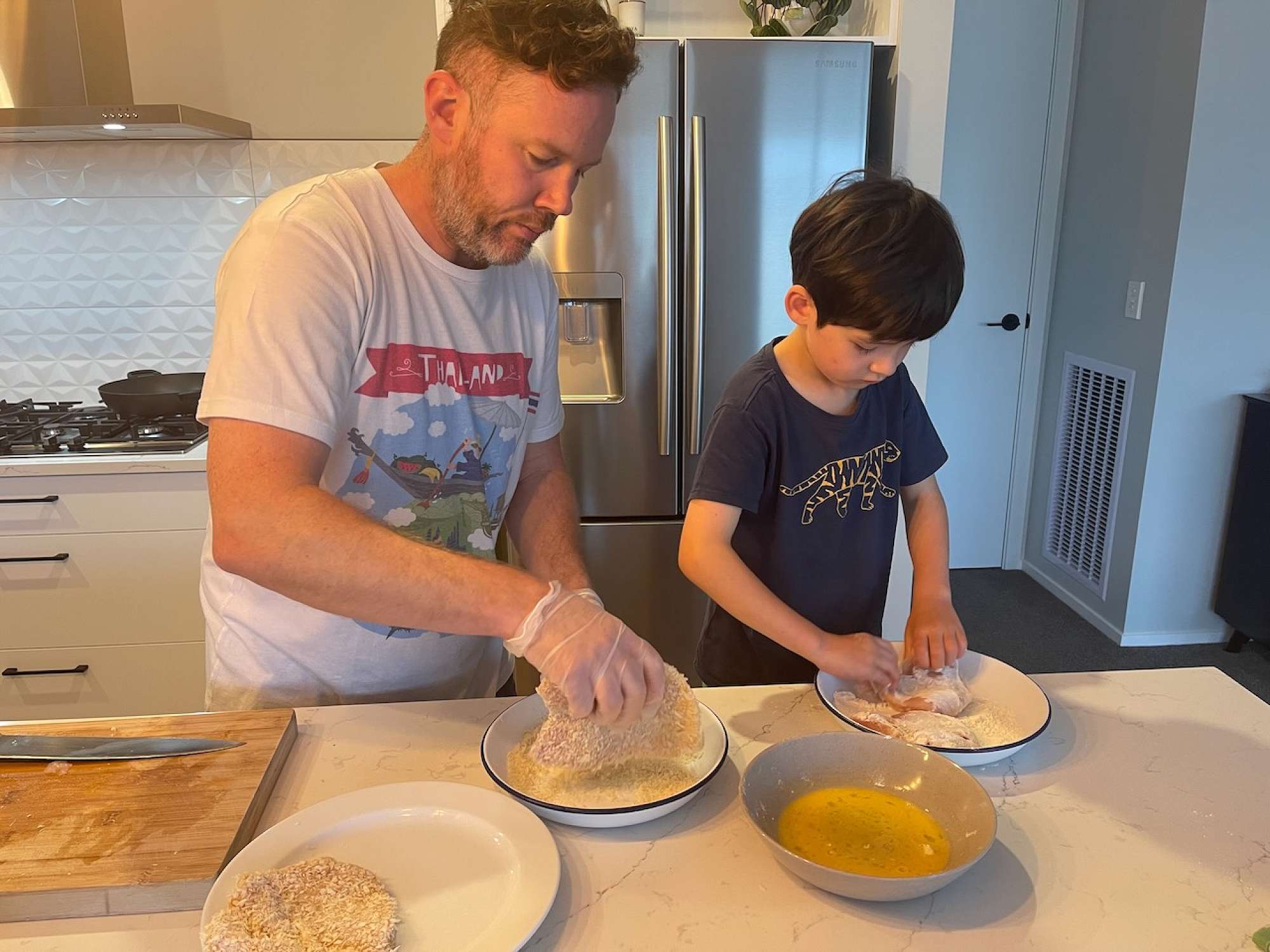 "This is a family favourite and a regular rotation in our household. It is an Australian classic (Xavier is half Australian on his dad's side). We opened a pop-up restaurant just after lockdown centred around Xavier's dad's famous parmigianas. We are teaching Xavier how to make this dish and he is always keen to pitch in and help. His favourite part is getting messy while dredging the chicken breasts." - Xavier + Whānau