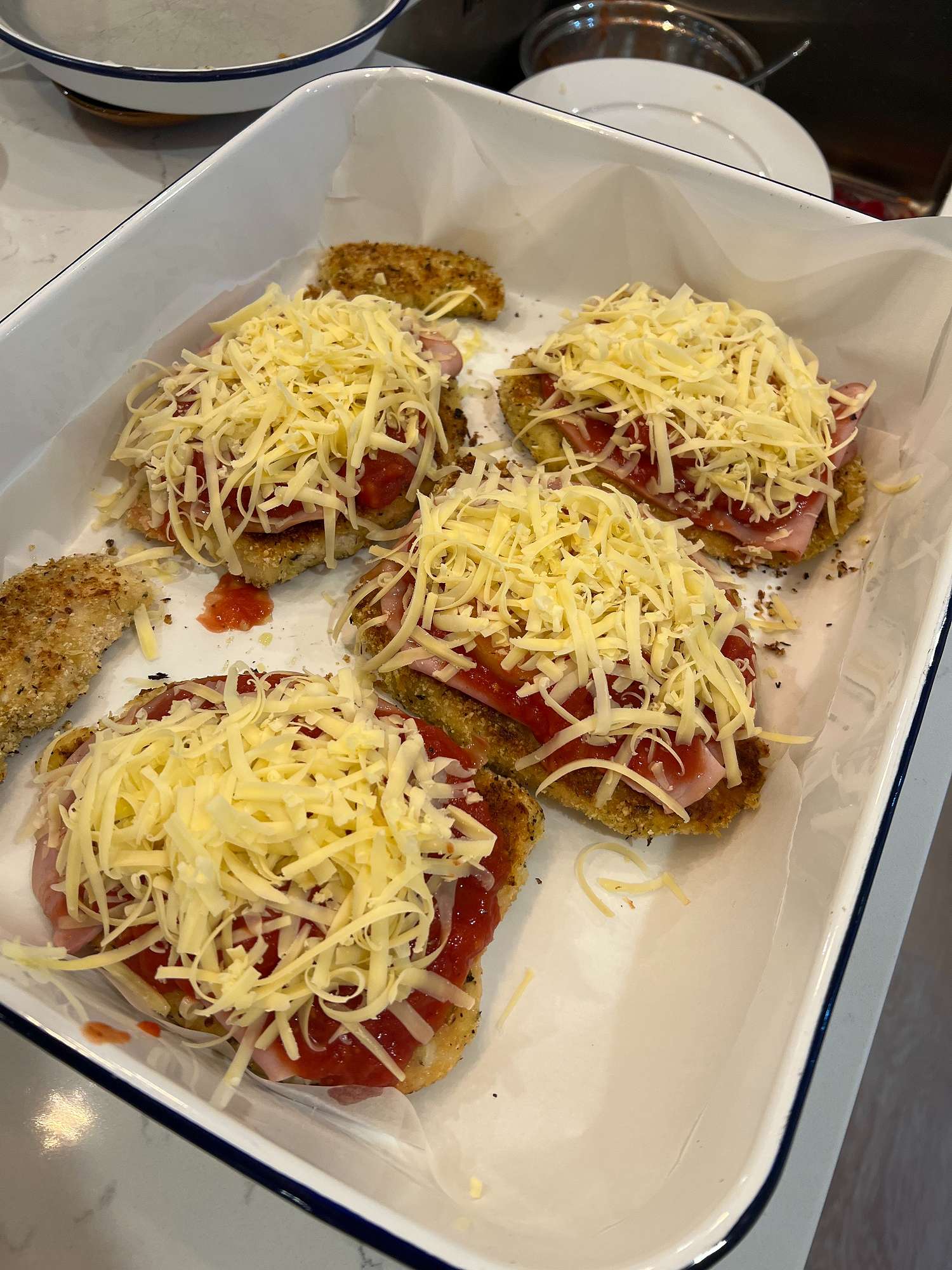 Place the trays of chicken in the oven until the cheese is bubbling and chicken is fully cooked through (approx 10 mins). You can switch the oven to grill for a couple minutes to brown the cheese.