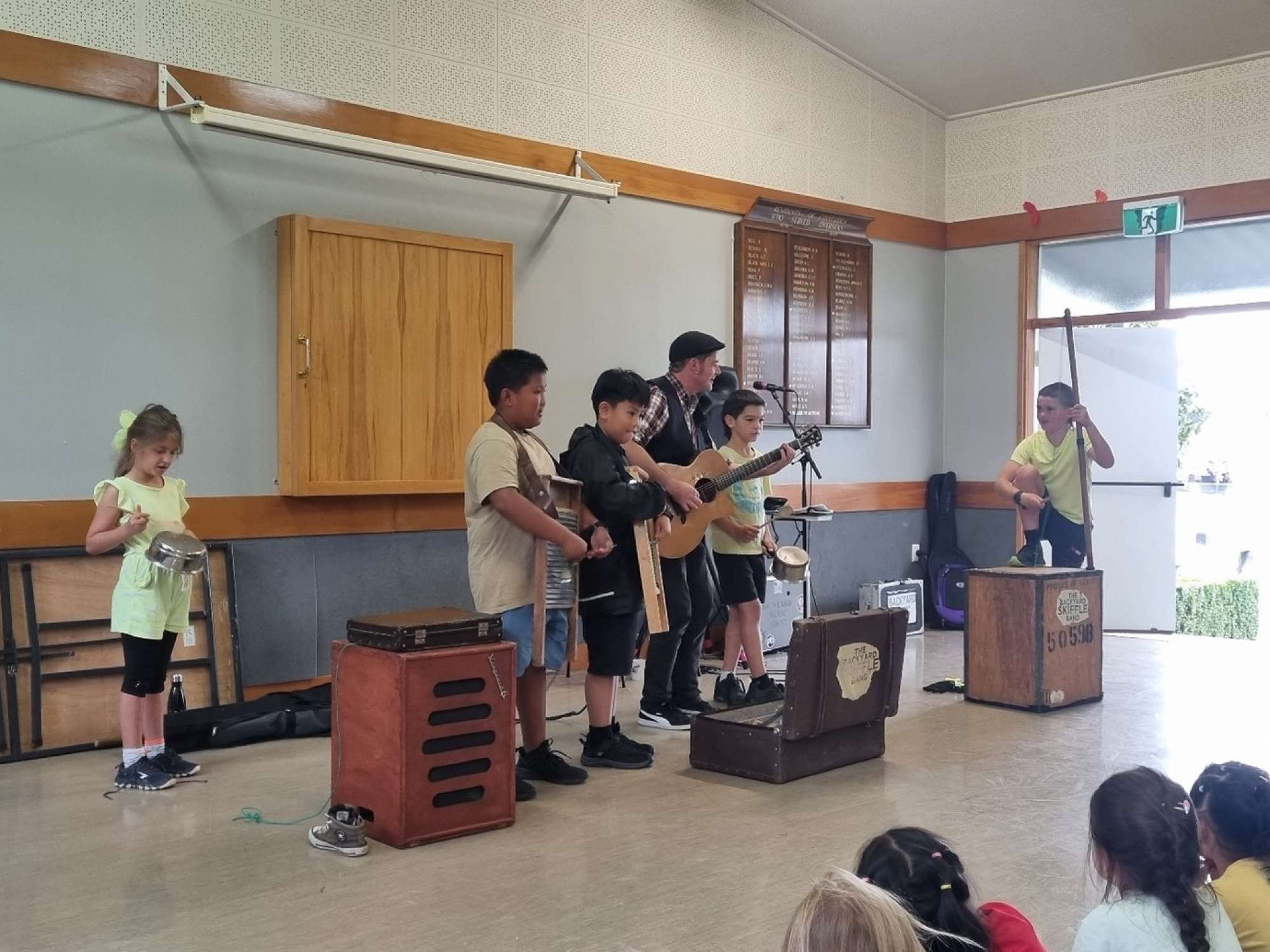While the duathlon was going on, we had Davey running a Skiffle workshop in the Community Room and later that day, Year 1 to 6 students attended a show where they learned what Skiffle band was and how to create instruments out of household items. I did ask the children to ask permission from their parents and whanau at home before raiding the kitchen cupboards – we all hope for your sake this happened! Davey is an excellent musician and was hugely entertaining. It was a wonderful way to finish before the long weekend.