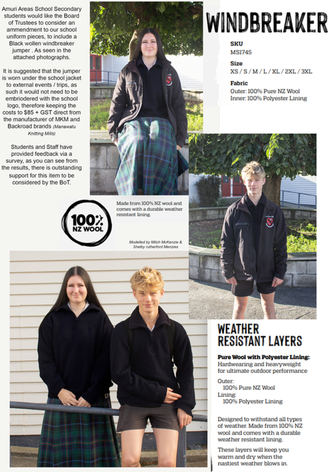 At the beginning of the year I was approached by a Year 10 student Mitch McKenzie. He expressed his unhappiness around the school uniform and being cold during winter months and that he would like to see a jumper available similar to a ‘Backroad’ jersey. I explained to Mitch that there was a process that needed to be followed around changing the uniform code set by the Board of Trustees and he was resolute in attempting to put forward his idea.