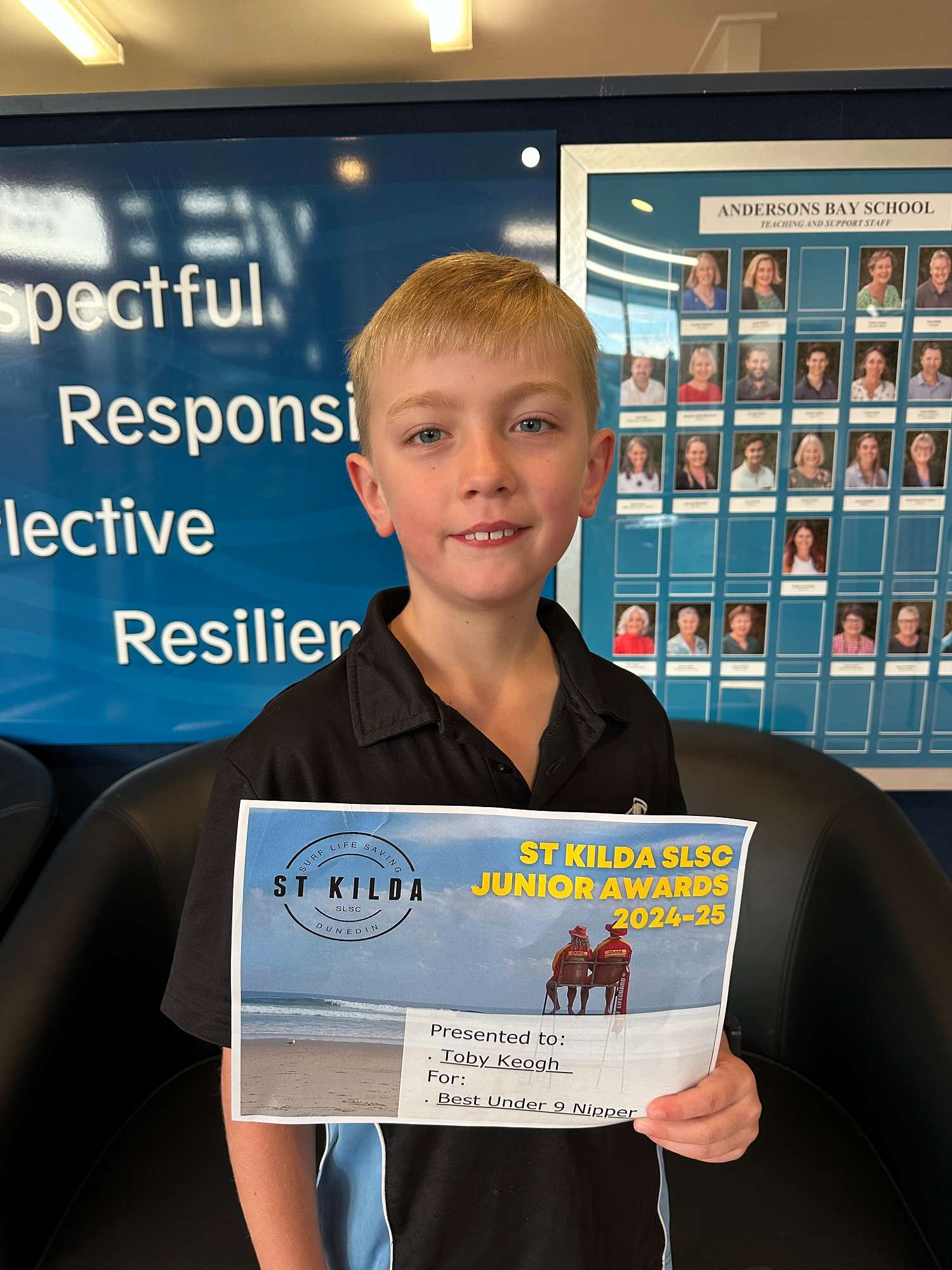 Toby was awarded a St Kilda Surf Life Saving Club Junior Award 2024-25 for Best Under 9 Nipper
