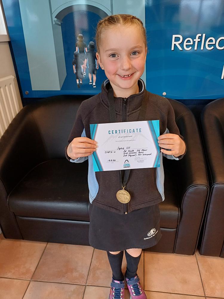 Sophie was awarded Aspiring Gymsports Certificate of Achievement being placed 1st Vault, 1st Floor, 3rd Uneven Bars, 1st equal All-around in her first gymnastics competition.