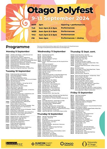 Our Kapa Haka group will be performing at Otago Polyfest on Thursday 12 September at 2:36 pm at the Edgar Centre. If you have time to go along and watch them, I know they would love a big audience! Polyfest is also an opportunity to be inspired by other Kapa Haka and Pasifika groups. Please check the Polyfest timetable below for a list of all the performances. It would be great to get a group from school going along together to watch some of the evening performances. If you were keen to go on Thursday evening, please let the school office know and we can co-ordinate a group who could sit together to watch.