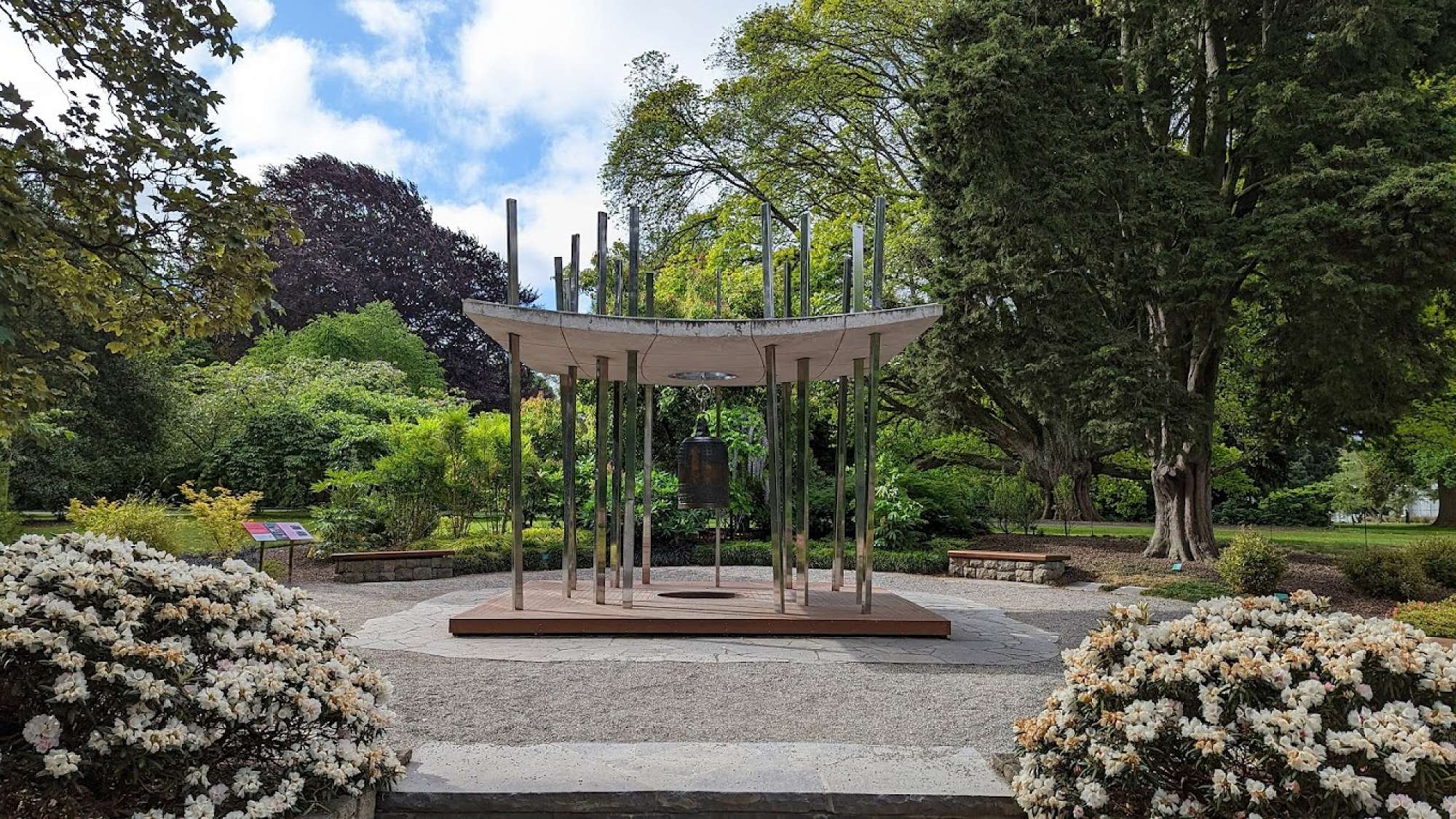 In a quiet corner of the Christchurch Botanic Gardens, there is a peace bell, surrounded by trees. This massive bell, weighing 365 kilograms, has the words "World Peace Bell" inscribed on it in English and Japanese. Behind are Japanese maple trees: trees which symbolise peace, serenity and tolerance. A Camphor tree grown from seed that survived atomic bombing also flourishes. Paving stones, engraved with the word "Peace" in 40 languages, surround the bell.