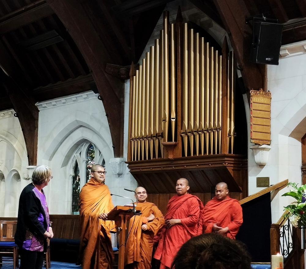 One of four Buddhist monks spoke. It was their very first time being inside a church and they believe that we all share a common humanity. Later, Andy Dickson echoed that we are all human beings and we are all the same.