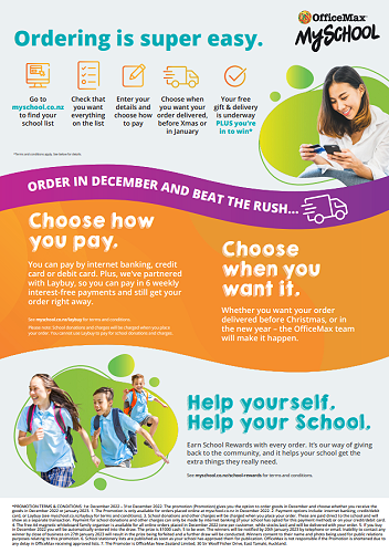 OfficeMax packs are available from its My School website at www.myschool.co.nz/aquinas. Parents who purchase packs with OfficeMax this month go in to win one of five $1,000 cash prizes!