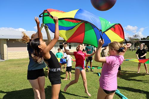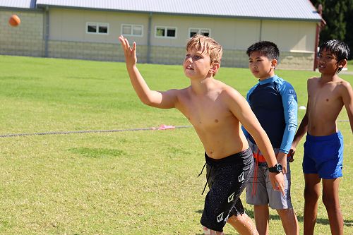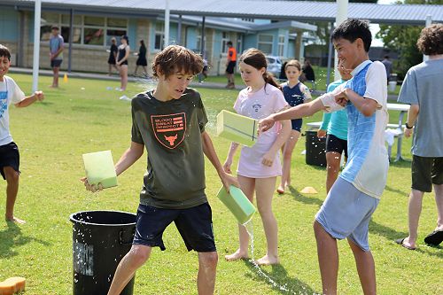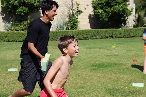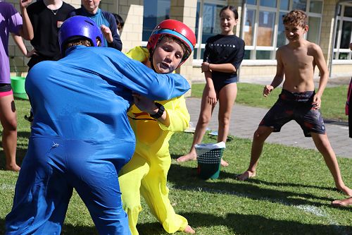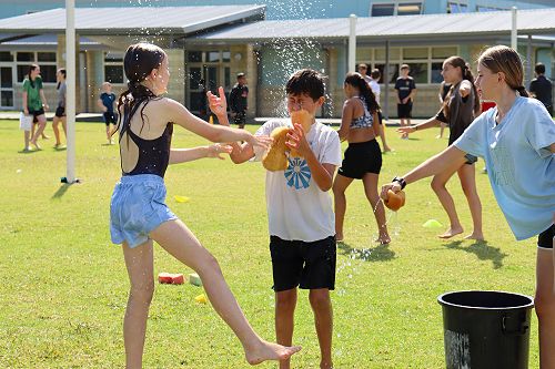 Fickle March weather gave way to brilliant sunshine for the finale, with teams of Yr 7s and their Yr 11 leaders rotating between activities such as giant parachute volleyball, the slip n’ slide, inflatable boxing, wet sponge fights, tug-of-war and egg tossing. The Aquinas quad was filled with music, great vibes, and wet, happy students.