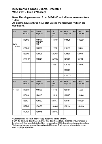 Morning exams run from 8.45 am until 11.45 am, and afternoon exams from 1.00 pm until 4.00 pm. All exams are three hours long except those marked with an asterisk, which will run for two hours. Please note this may impact transport home or part-time work. Students will need to manage this.