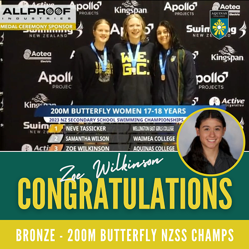 Congratulations Year 13 swimmer Zoe Wilkinson who won bronze in the 200m butterfly at the NZ Secondary School Swimming Champs last month.