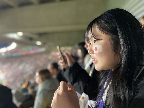 Before the game, we did face painting. The Japanese flag looks easy to draw but the reality was totally different. It is simple, that's why it is difficult! After that, it was time to watch the game. We sang the national anthem and cheered for the Japanese team with lots of energy.