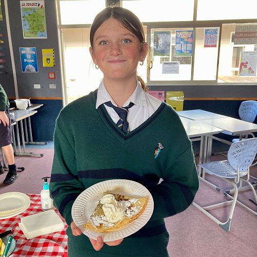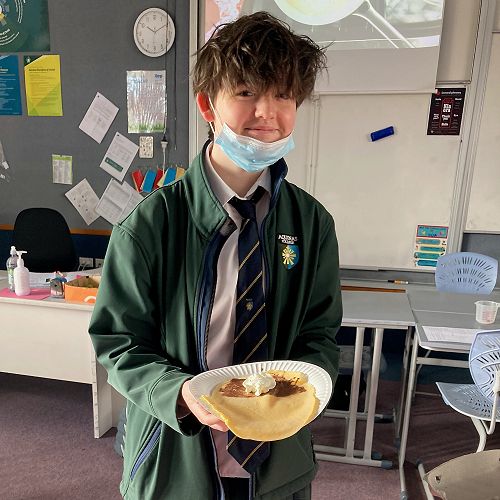 Year 9 have been studying the topic of food and meals and recently enjoyed a shared French breakfast. Whilst in Y10, students had fun making crêpes as a treat for working hard and completing their French speaking assessments. COVID derailed previous plans to share breakfast and make crêpes, so it was nice to finally get around to it! Crêpes, croissants, pain au chocolat… more great reasons to study French!