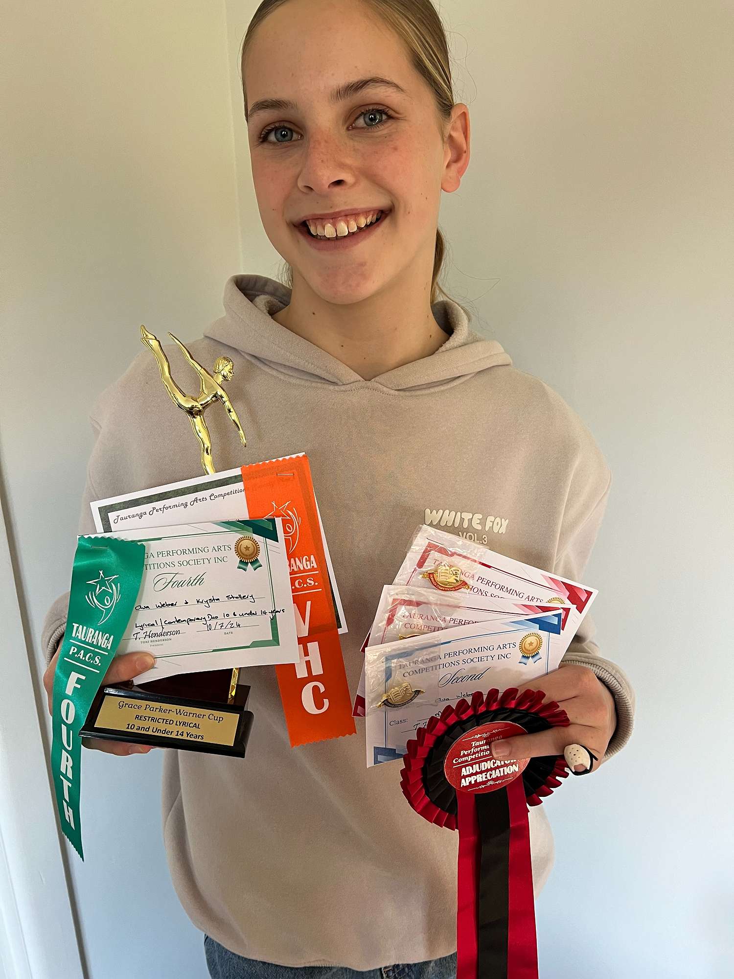 Paige also competed at the NZDA finals during the holidays. Her dance troupe from The Academy won gold in the jazz and contemporary sections. It also scooped third place at the NZ Tap Nationals in Palmerston North.