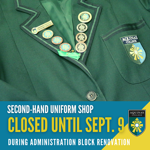 Visit this articleThe Aquinas Second-Hand Uniform Shop will be temporarily closed until September 9 due to the renovation of our Administration block.