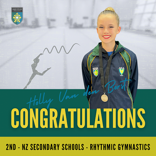 Visit this articleA round of applause for Y11 student Holly Van den Borst! Competing for Aquinas, the rhythmic gymnast finished second overall at the recent NZ Secondary Schools competition.