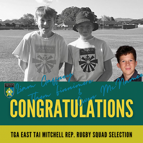 Visit this articleAnother proud moment for Aquinas! Y8 students Thom Finnimore, Liam Gaffney and Owen McNamee have been selected for the 2022 Tauranga East Tai Mitchell Rugby Team.