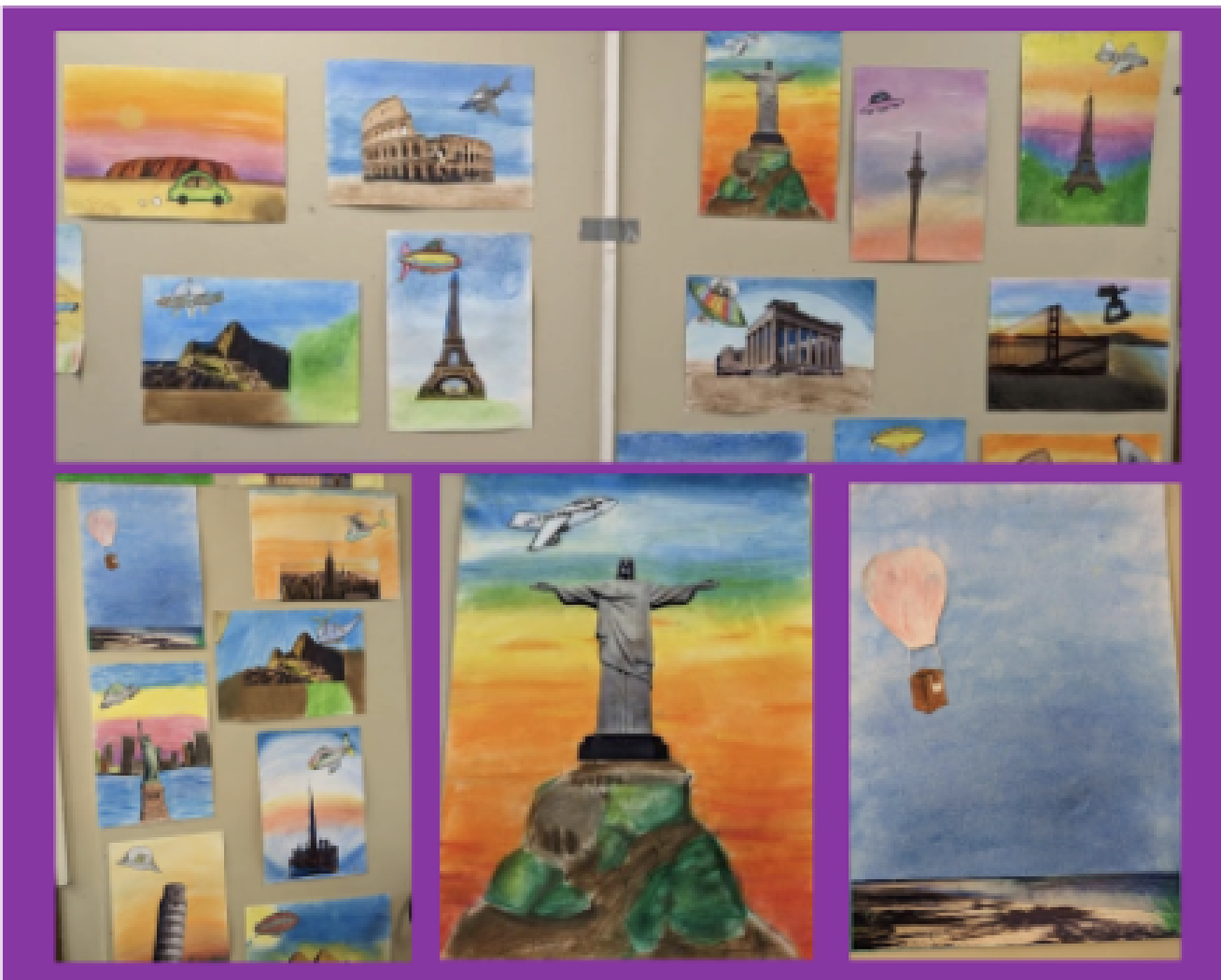 Our term 1 Art focus was 'journeys'. For this we chose a landmark to create the surroundings and the mode of transport to tell the journey. We used pencil first, then vivid outlines and pastels. We cut out our mode of transport separately and glued them on our blended pastel background. To complete our art, we used hairspray to hold it all in place. Here are some examples of our art. They look great in our new classroom!