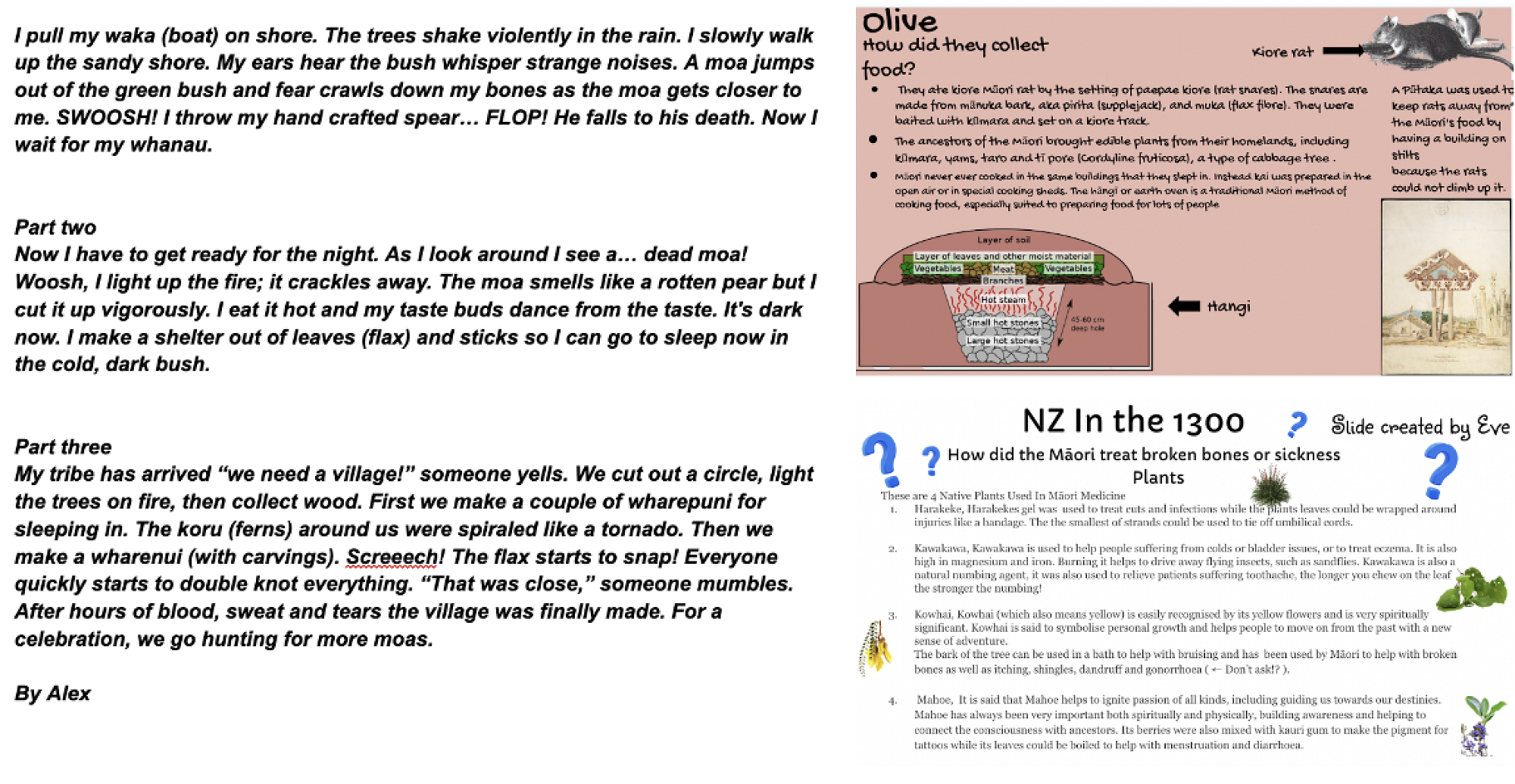 For year 7-8, creative writing was a great way to put themselves in the shoes of early explorers and describe the process of arriving in a new country and facing challenges of survival. They also used the ‘jigsaw’ strategy by researching a key question from our wonderwall then sharing back to their small groups. They combined their mahi into slide shows to then share with the class.