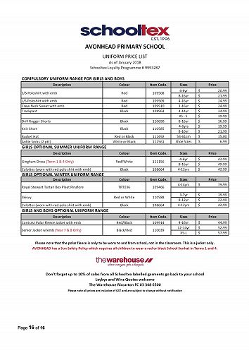 Uniform items are available at The Warehouse, 265 Blenheim Road Ph 348 6500 and Mainland Uniforms@Ilam (Ex Grasshopper) 405A Ilam Rd, Fendalton, Christchurch, Phone 351-7666. You can buy uniform on-line from Mainland by going to their website: www.mainlanduniforms.co.nz.