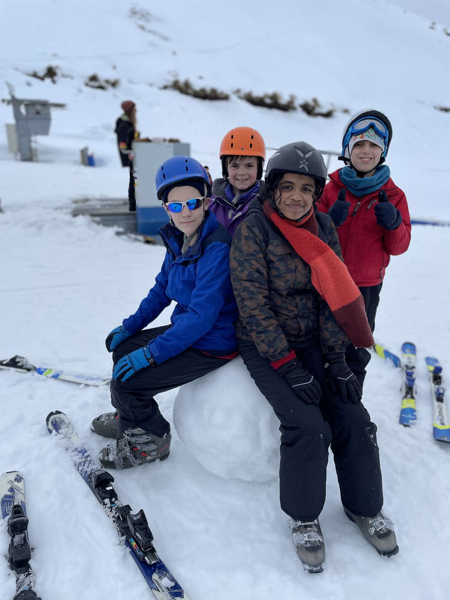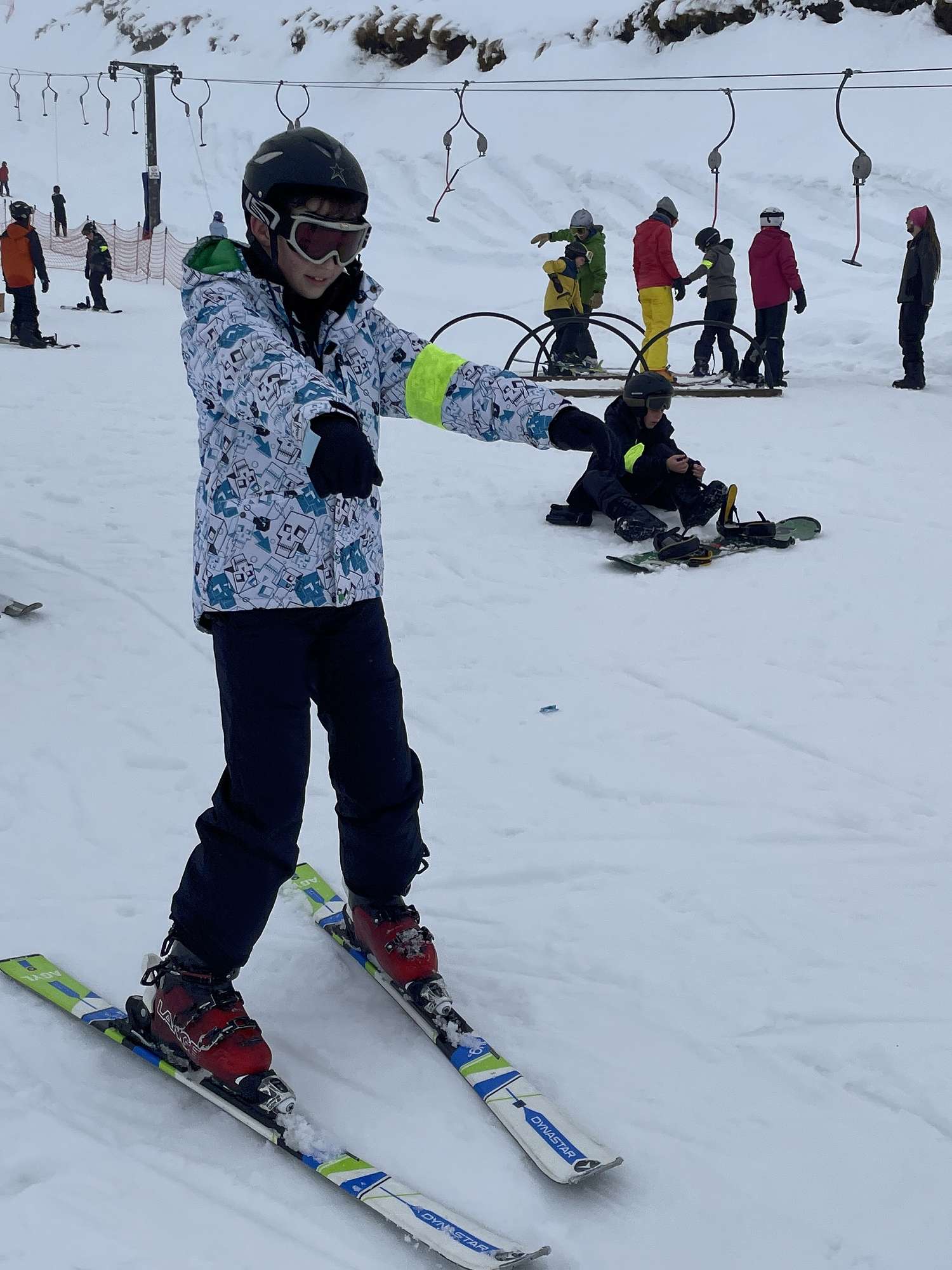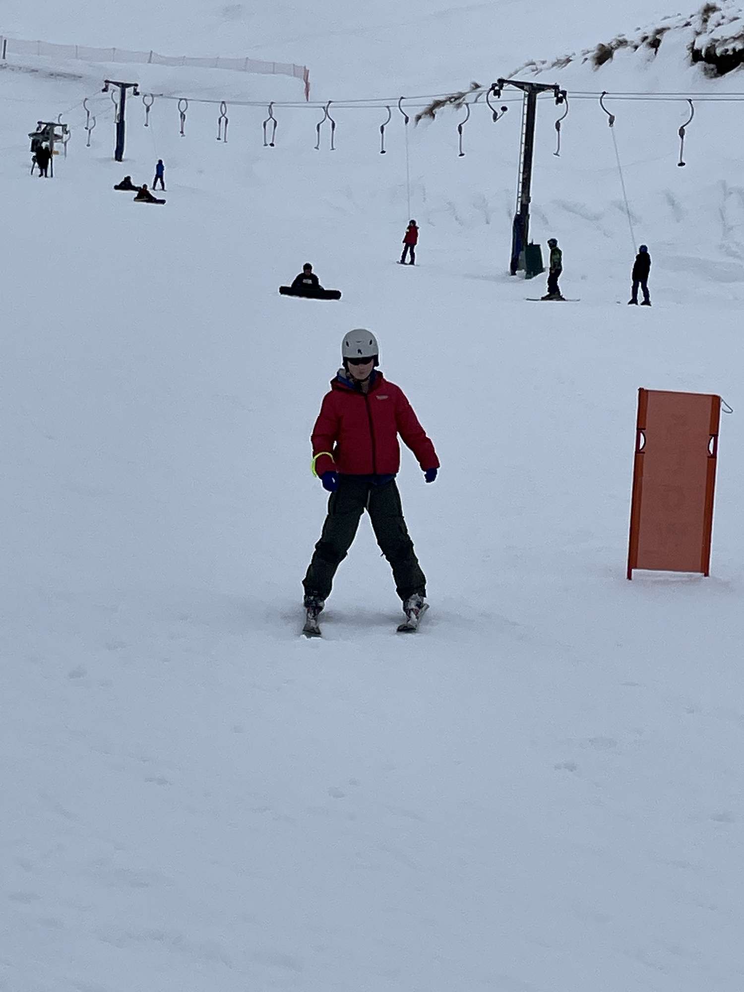 I got up at 5.30 in the morning to get ready for the ski trip. My mum was awake, and my dad was also getting ready because he was coming as a parent help. My sister was still asleep. I got dressed slowly because I had a lot of layers to put on. I went and had some breakfast and dad had his too. Then I said bye to my mum and got our bags and put them in the car. We drove to school and met in the hall. I found my friends, and we waited around before finally getting onto the buses. We were off! My dad went in his car with some other parents. We drove through the mountains and drove up the snowy hill to Porters. After over an hour we got off the bus and got into our ski groups. I was with all my friends except Mehual :(. Our tutor was Charlie. He took us to the beginners slope which was really gentle. The ski boots were so hard to walk in and were extremely uncomfortable. But we all got our skis on and did some skiing or snowboarding. The magic carpet was really fun and after our lesson we had free time. We did snowball fights, caving and more skiing. After that we all went home on the bus.