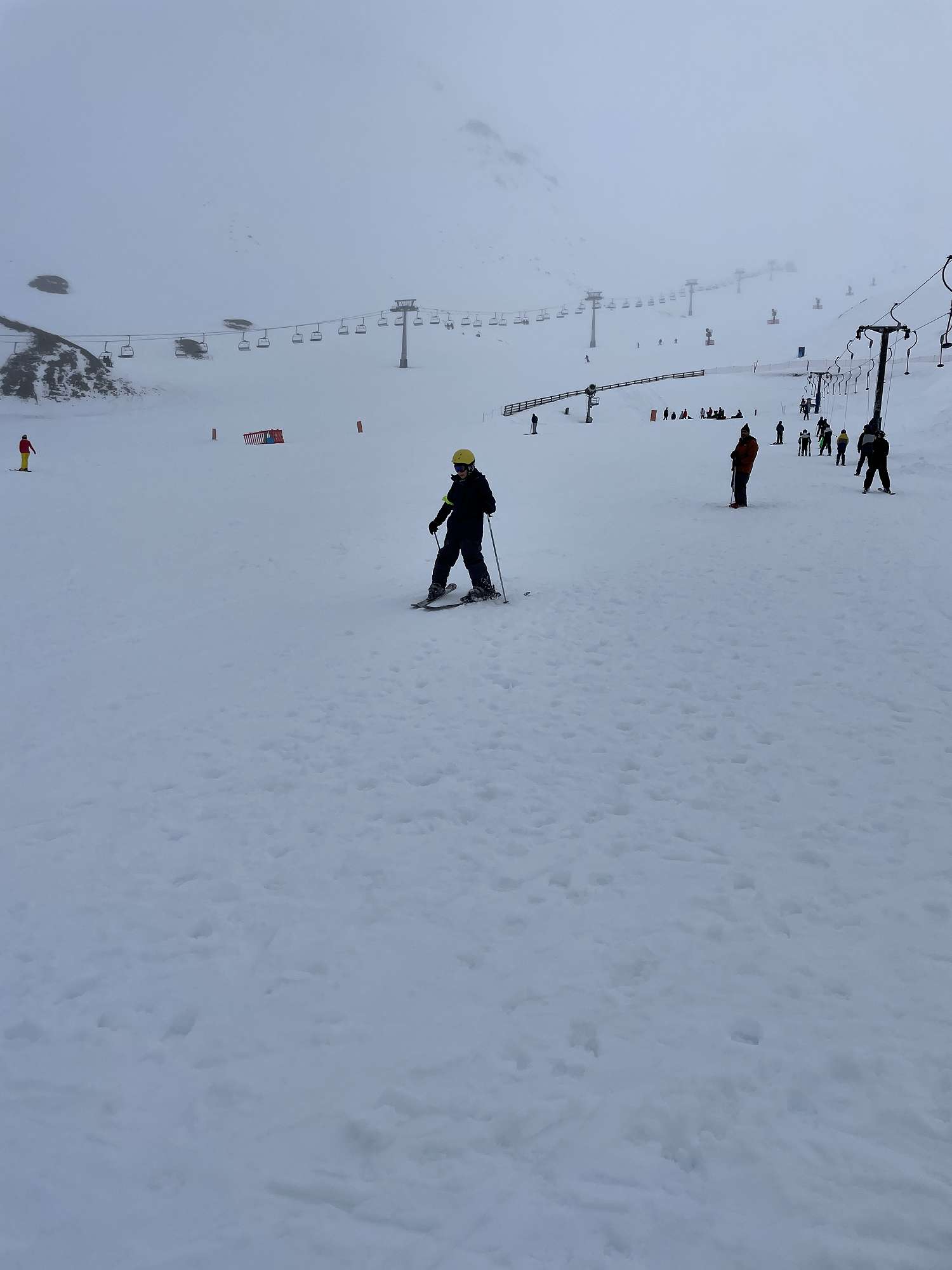 About an hour later our lesson finished and we were free to do whatever we wanted, so I went towards the big intermediate slope. So steep and very scary, nerves filled inside but I was going to do it! I skied towards the poma and got the thumbs up. Up,up I went till I finally let go of the poma and slid down the hill. Lots of twists and turns were made as I zoomed down the mountain. Over and over again I skied down until we had to finish up and go.