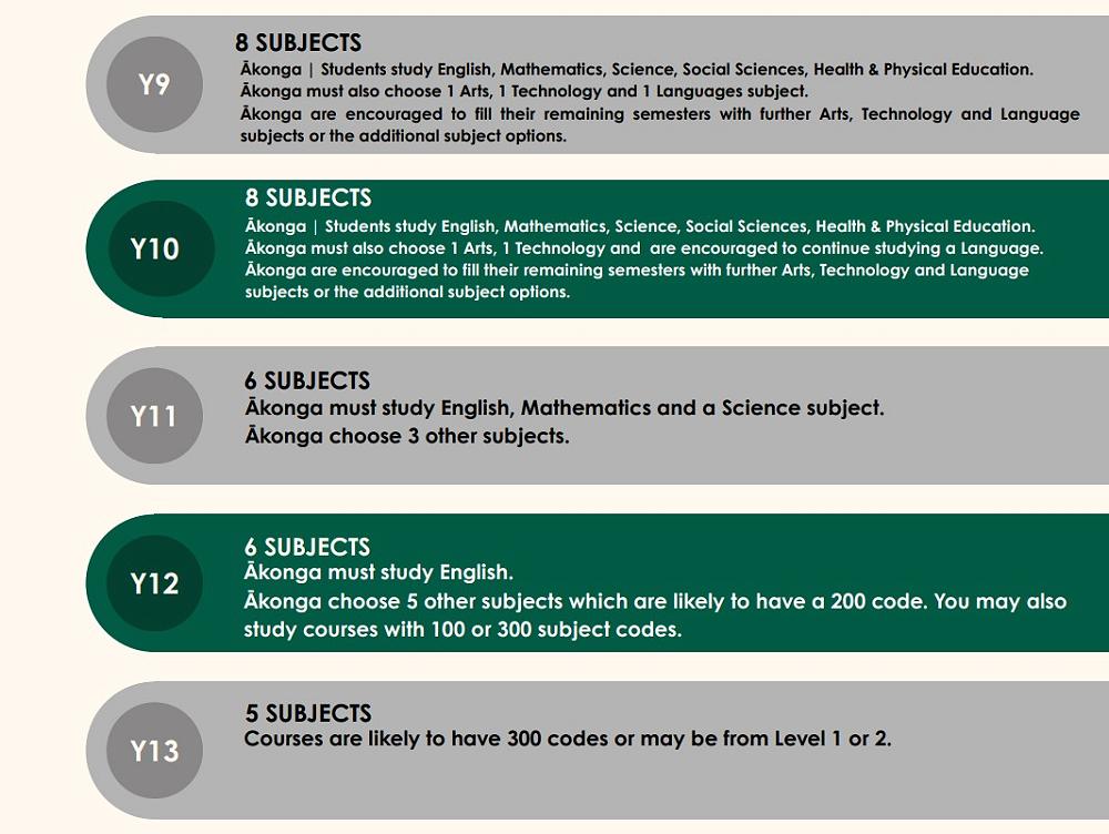 Ākonga are encouraged to fill their remaining subjects with further Arts, Technology and Language options or the additional subject options for Y10.