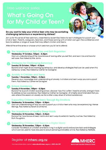 Do you want to help your child or teen who may be exhibiting challenging behaviours or experiencing distress?The Mental Health Education and Resource Centre has a series of free webinars, presented by expert facilitators to learn strategies to support your child or teen. Parents, caregivers, teachers, and those working with children can gain the confidence and tools to address a range of issues that may affect children and teens.Attend the entire series or choose which webinars you’d like to attend.Register at www.mherc.org.nz
