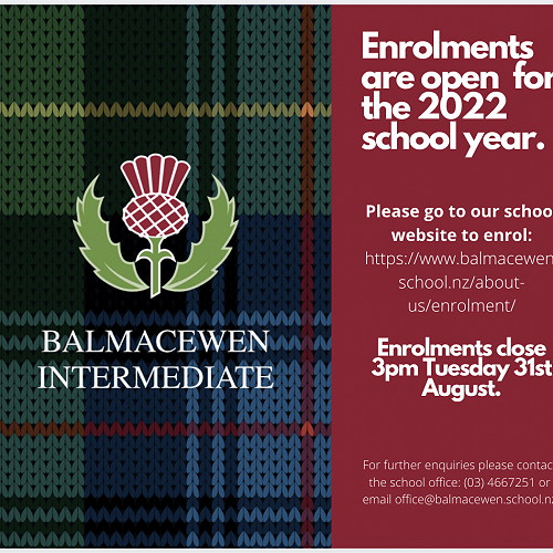 Visit this articleEnrolments for the 2022 school year are now open. Please go to https://www.balmacewen.school.nz/about-us/enrolment/