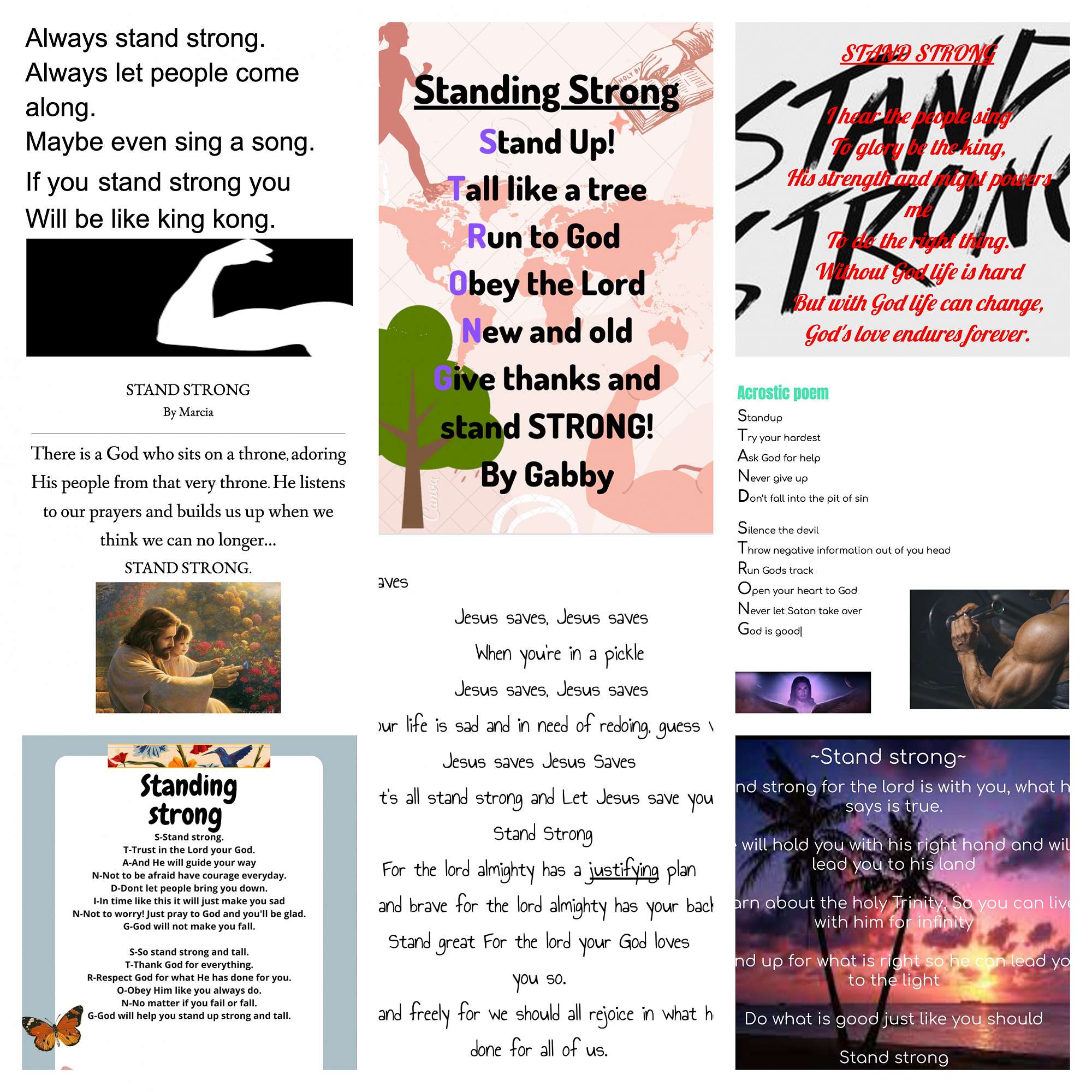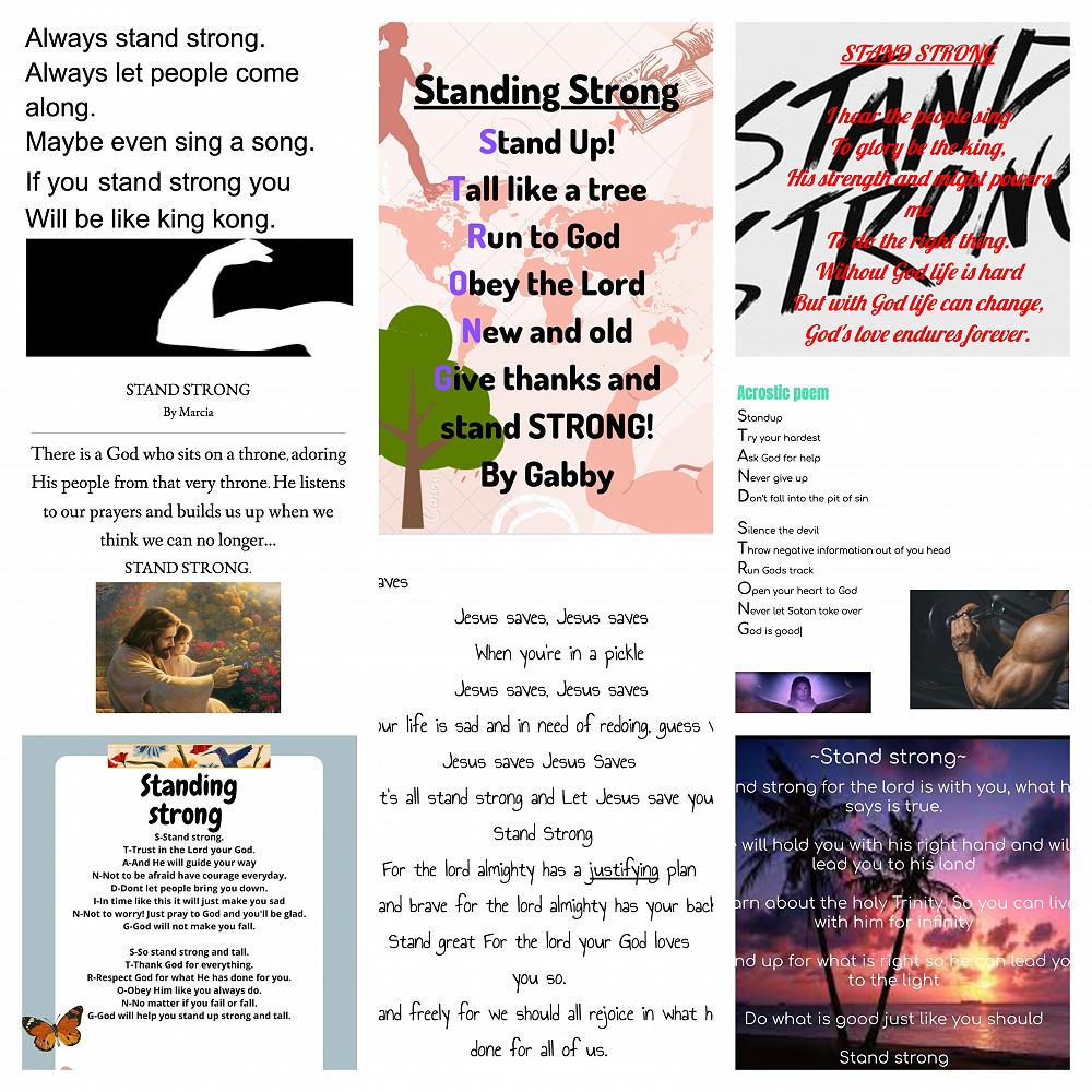 I was very honoured and proud of Room 5 this week especially, as it was our turn to present a special item during chapel. Room 5 shared their thoughts of what it means to STAND STRONG through poetry (sticking to the theme of Pastor Ama's week of worship). Those who were with us had to create and write creatively, and here are some snaps shots of some of our students work.
