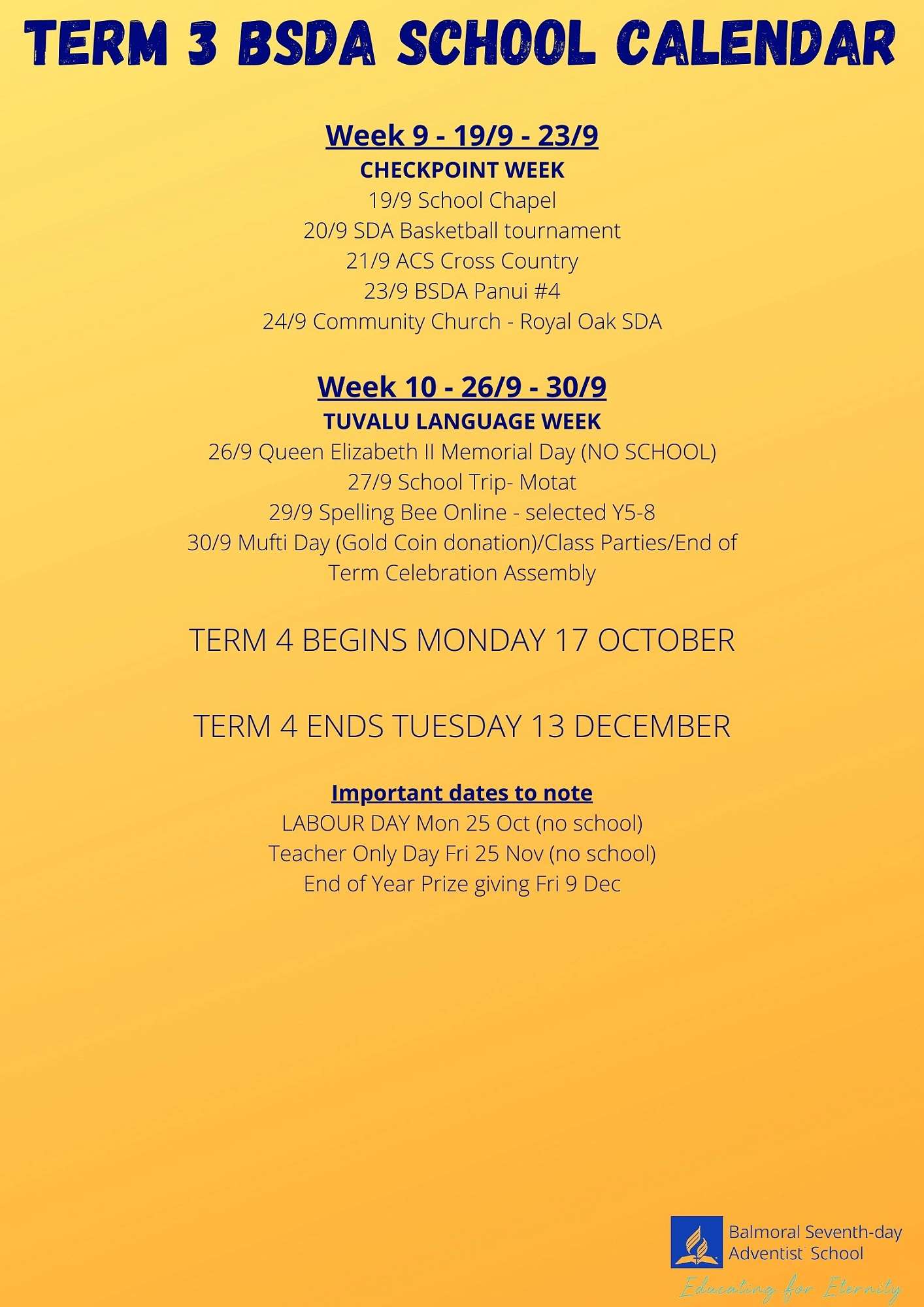 As of 23/9/22, take note of Week 10 events and our term 4 dates.